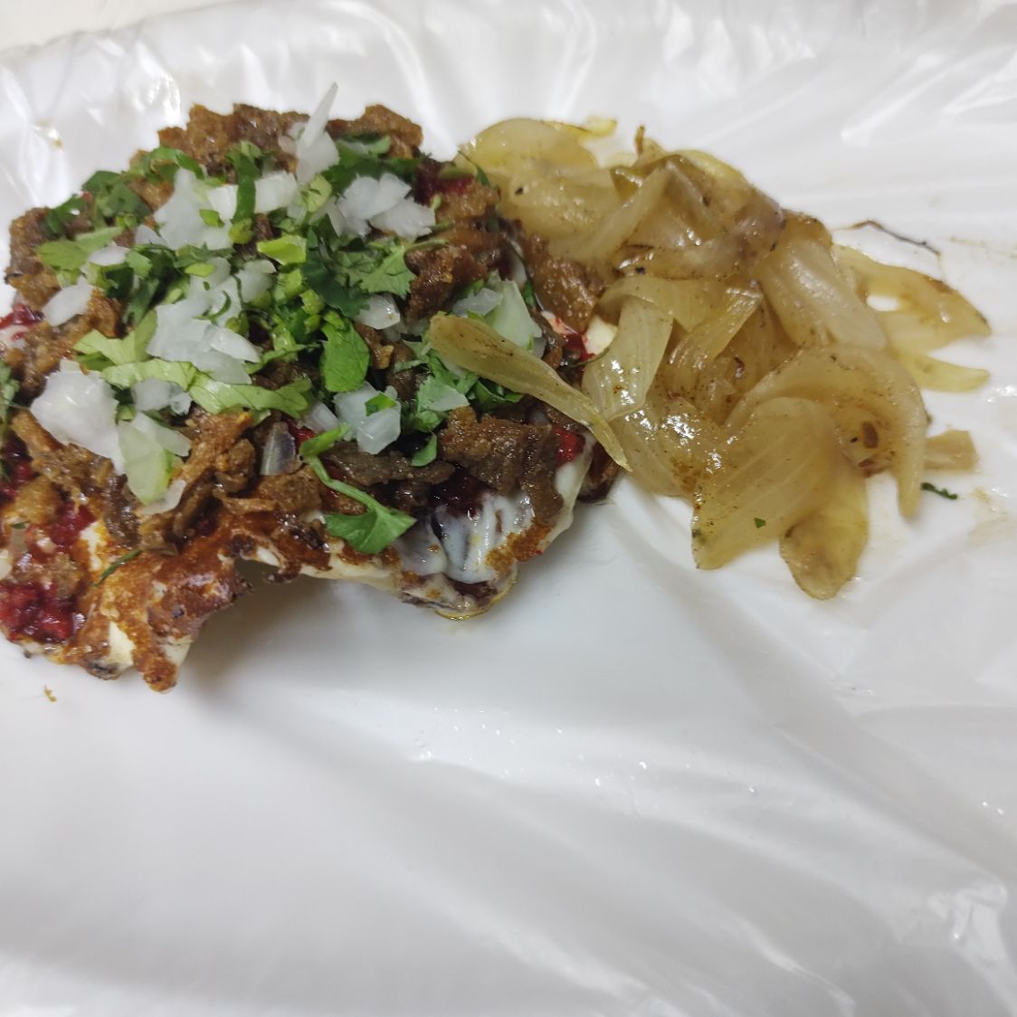 Tortilla dorada con una capa de queso fundido, bistek y chorizo