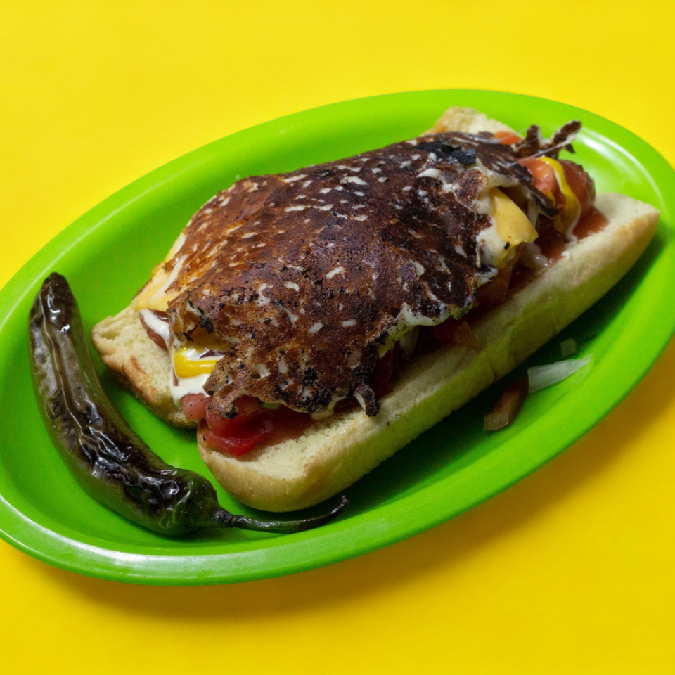 Salchicha carne al pastor queso blanco queso amarillo jitomate cebolla catsu mayonesa y mostaza