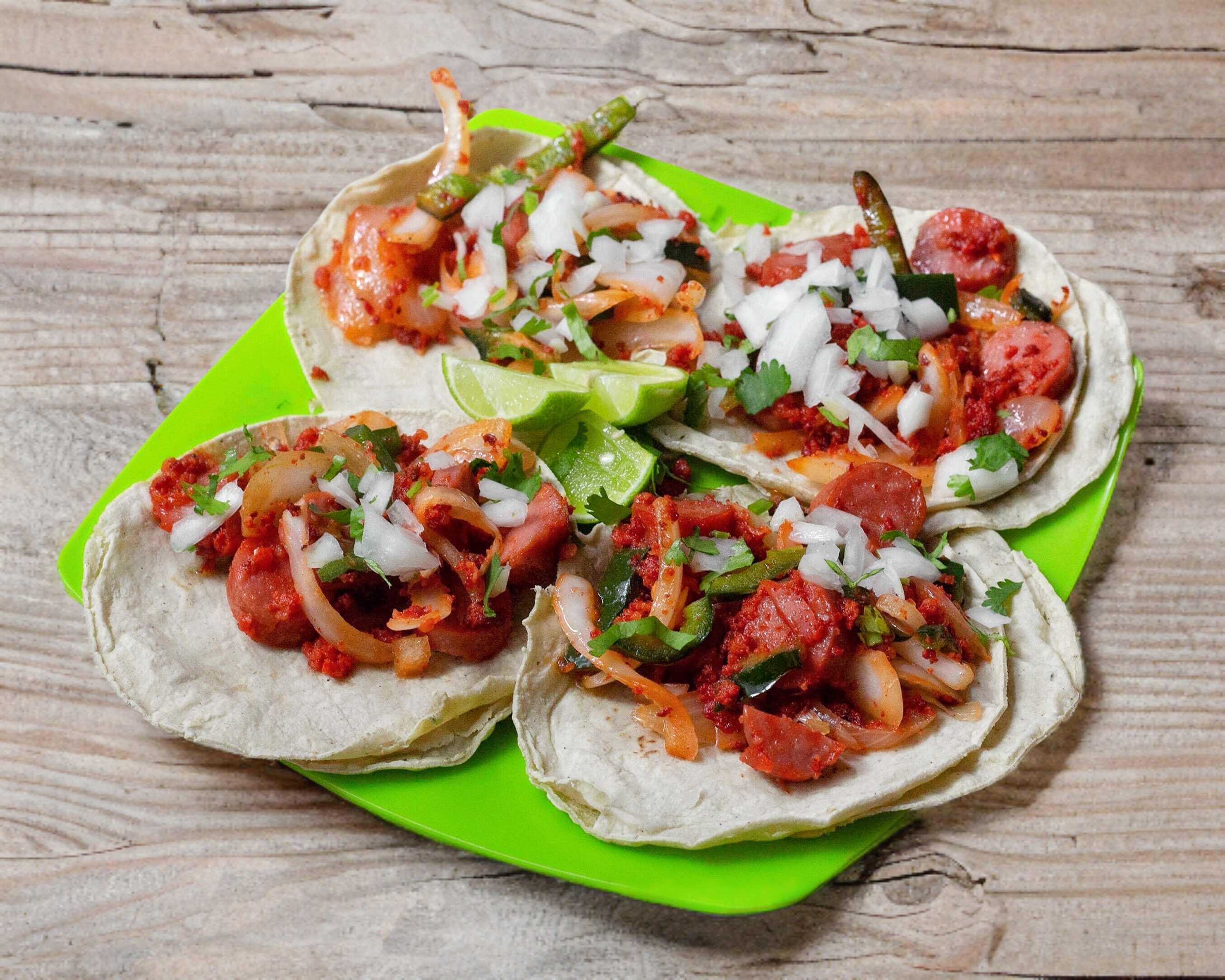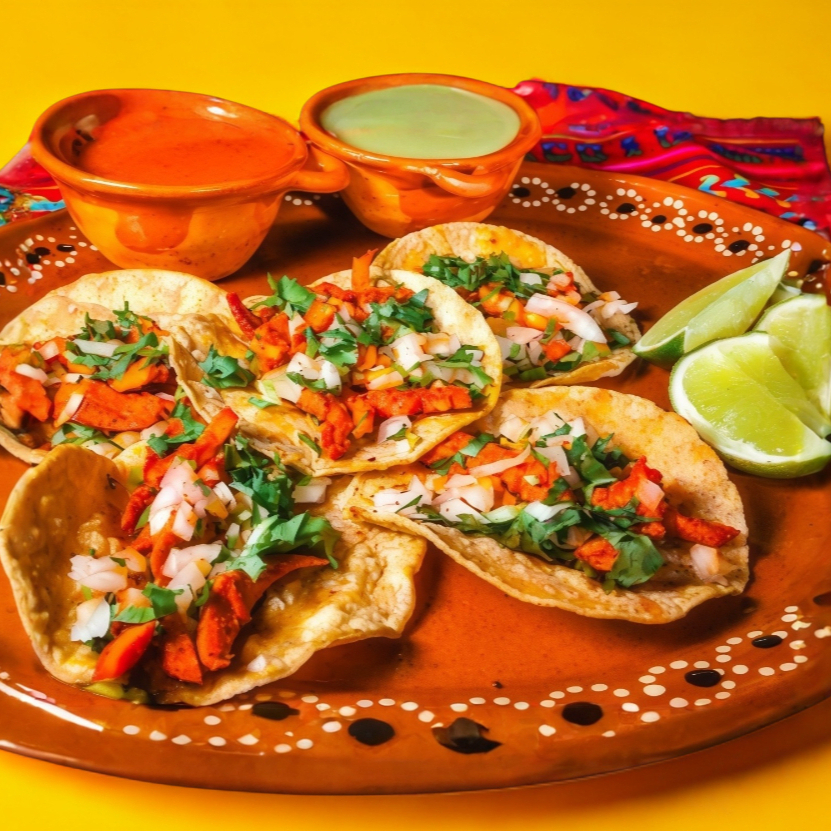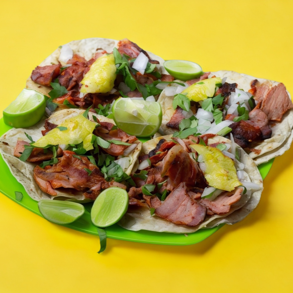 Porción personal: 6 tacos con carne al pastor + verdura + Limón