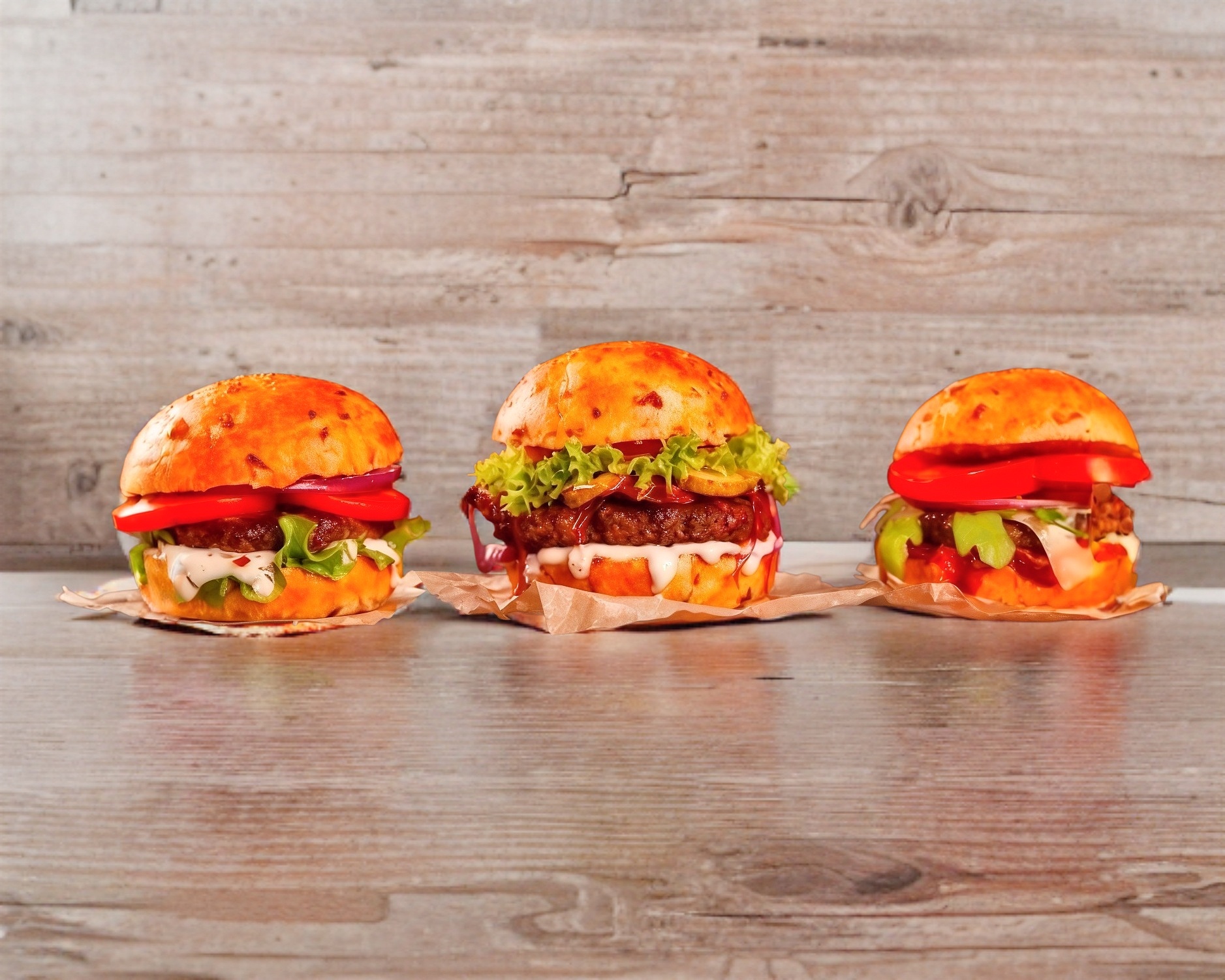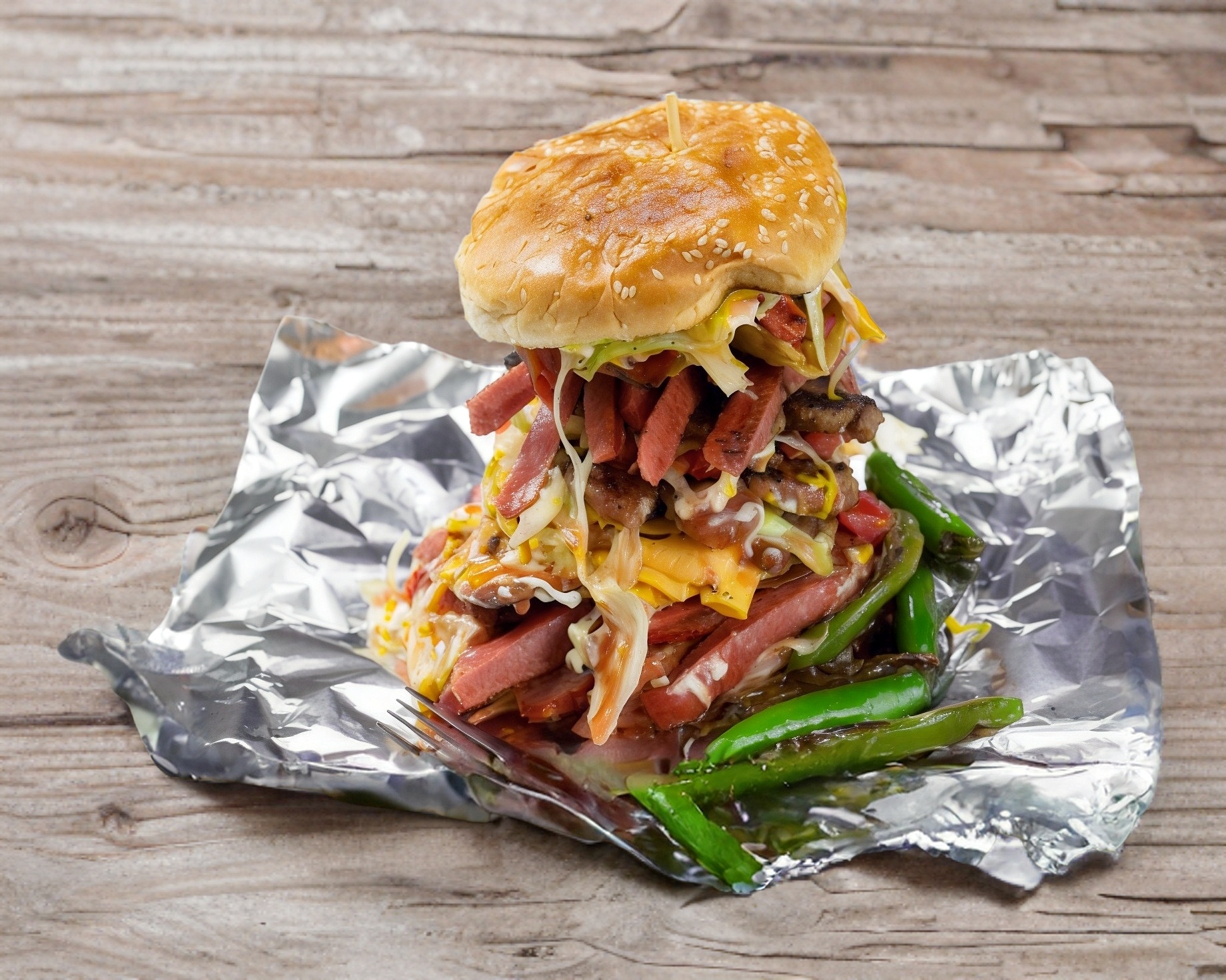 Hamburguesa porción personal: proteína aprox. 90 g en crudo, pan con ajonjolí, doble carne al pastor, piña, queso blanco, queso amarillo, 1 rebanada de jamón, salchicha, lechuga, jitomate, cebolla, kétchup, mayonesa y mostaza. Todos los ingredientes vienen preparados.