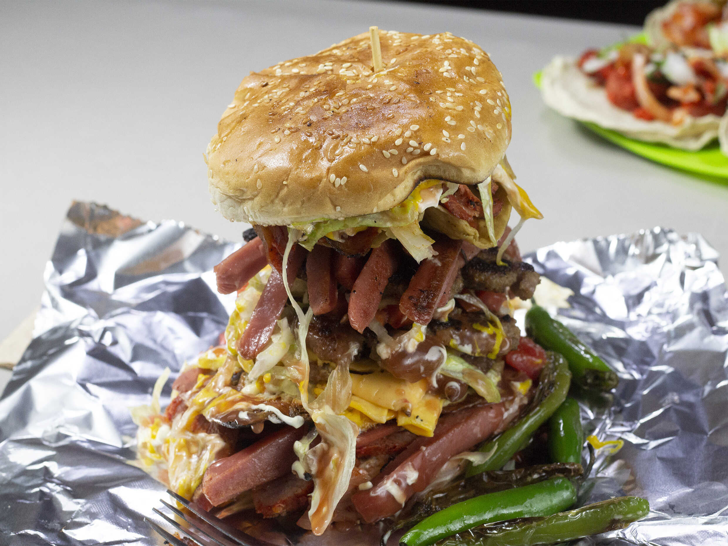 Hamburguesa: proteína aprox. 90 g. Contiene carne, piña, jamón, queso blanco, queso amarillo, salchicha, lechuga, jitomate, cebolla caramelizada, mayonesa y mostaza. Todos los ingredientes vienen preparados.