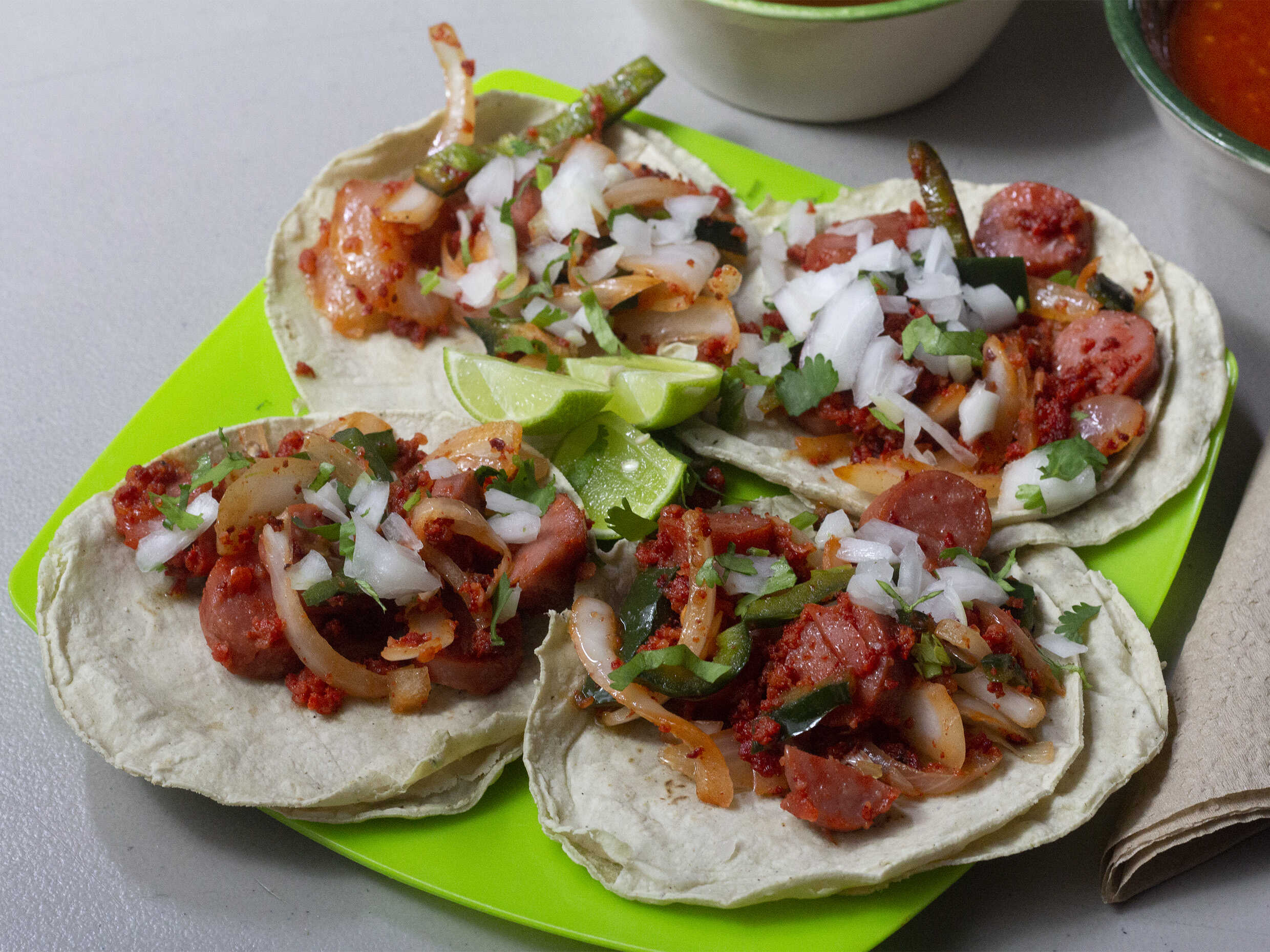 Carne al pastor con queso y cebolla chile pimiento y tortillas