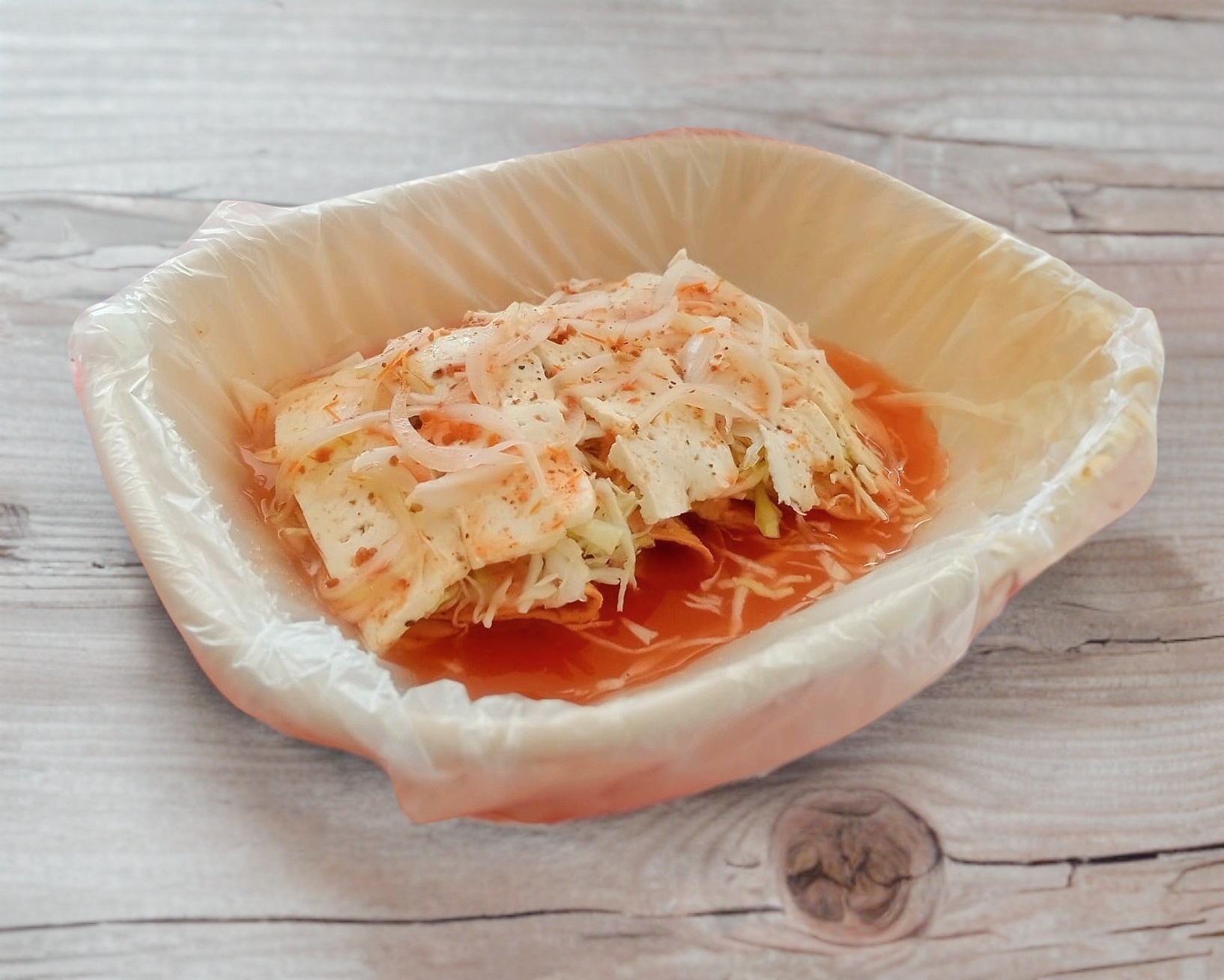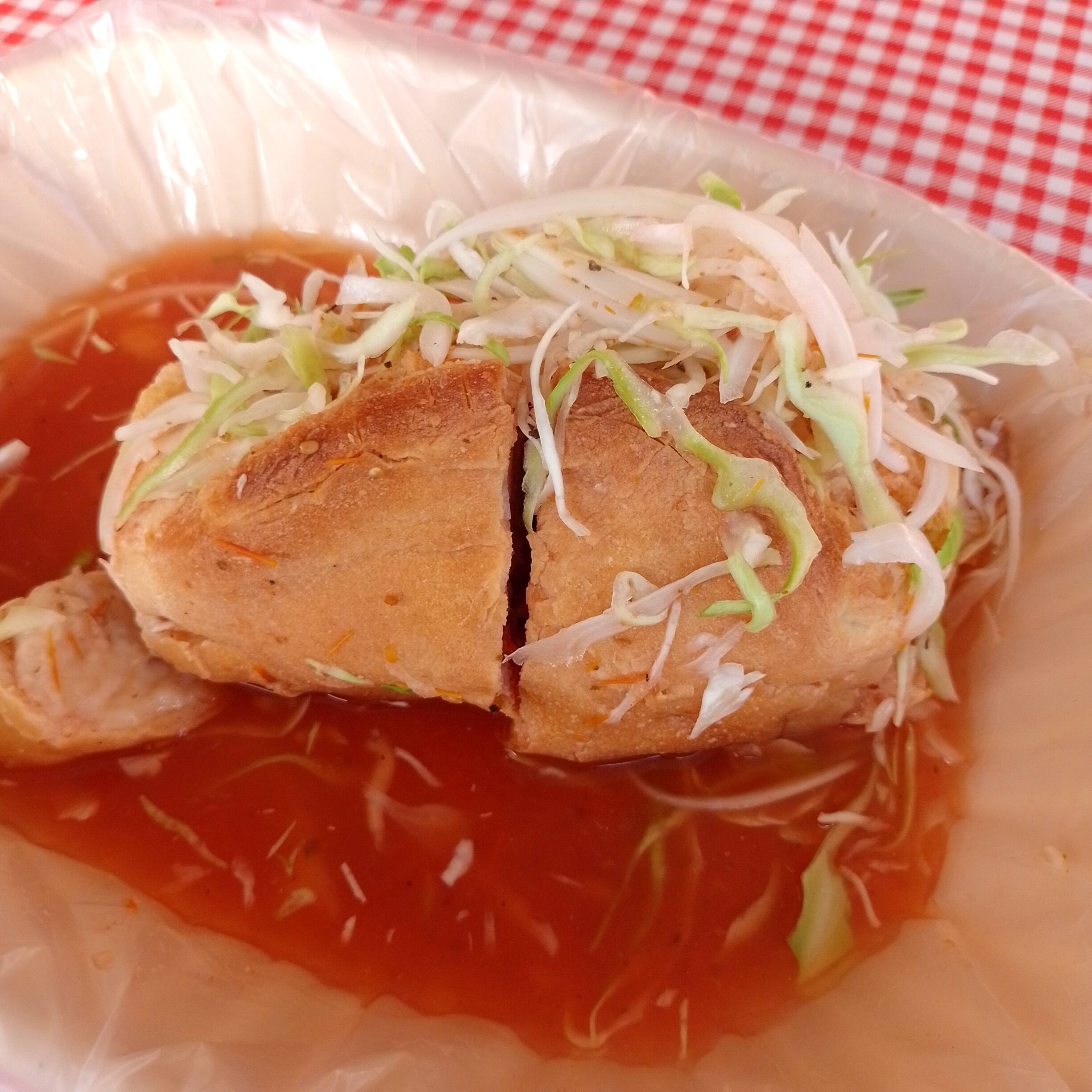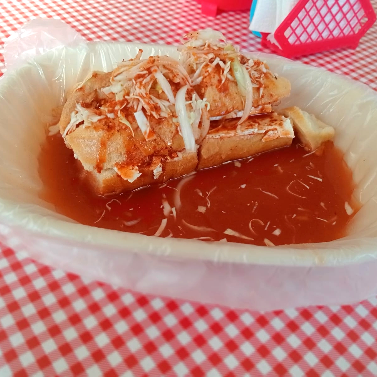Bolillo de leña con frijol, carnitas y verdura bañado en deliciosa salsa de jitomate dulce