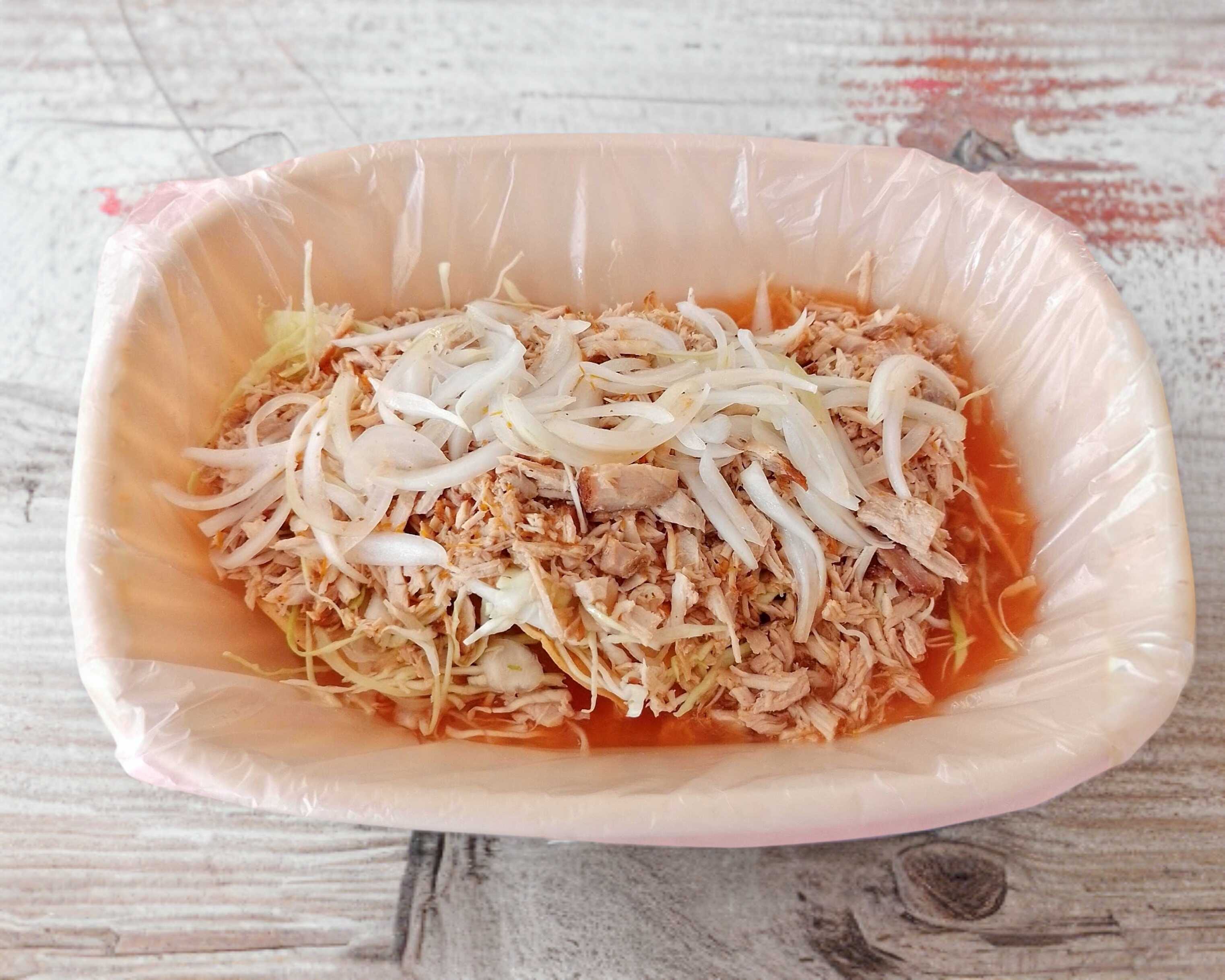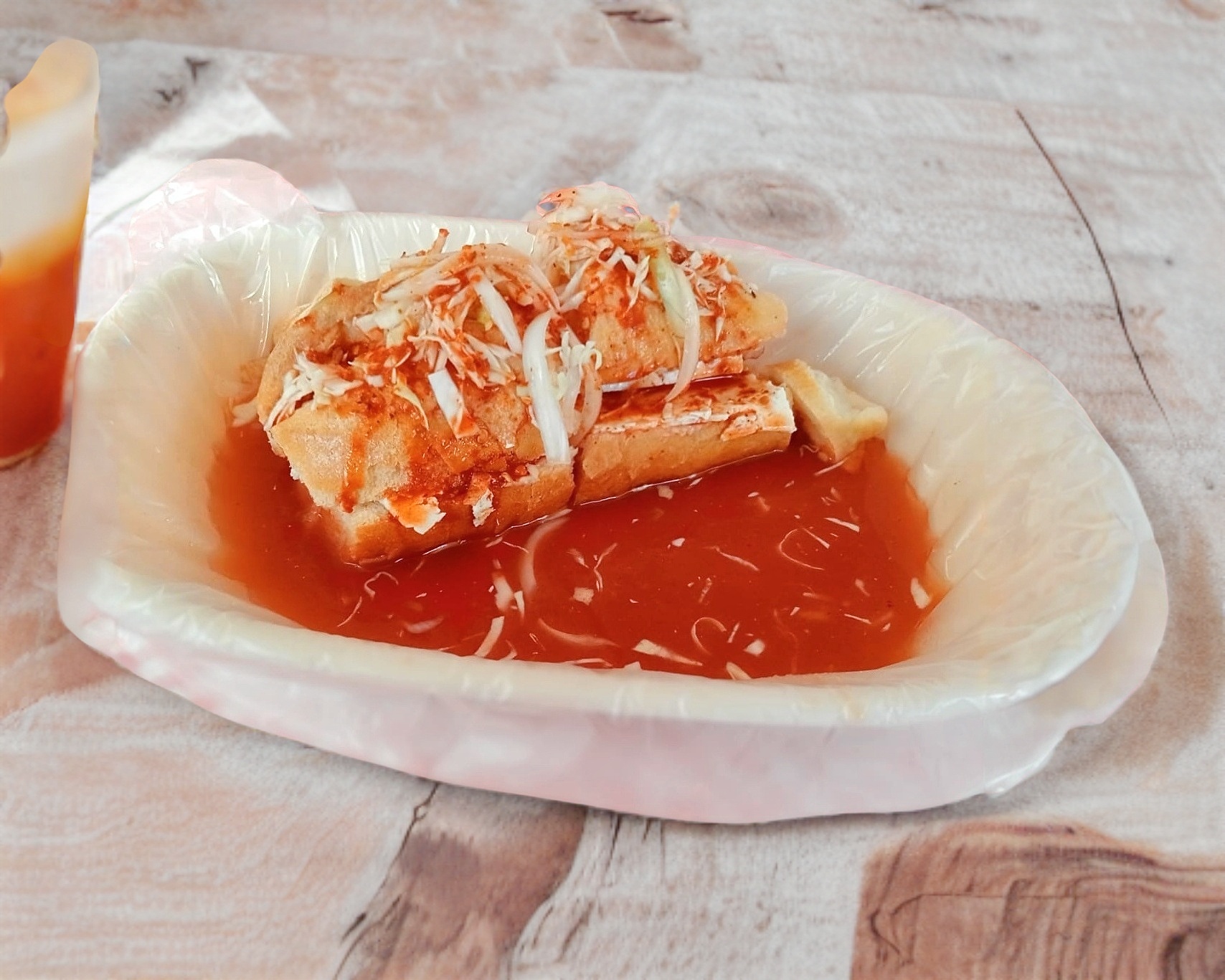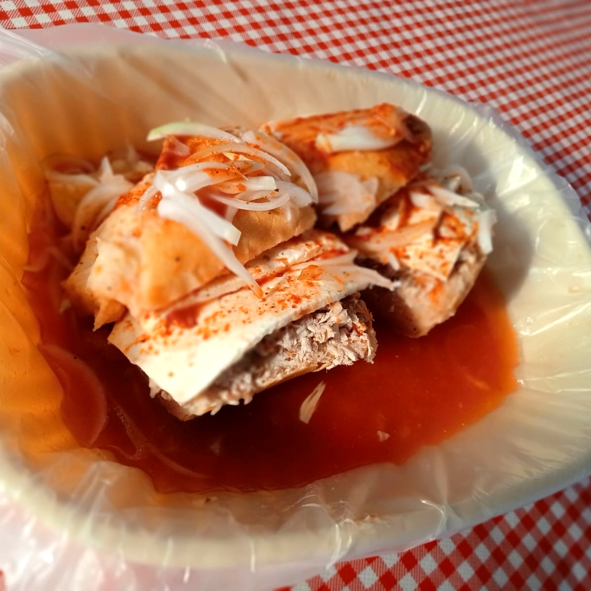 Taco dorado con frijol y carne (80 a 100gr) con repollo y cebolla bañado con salsa