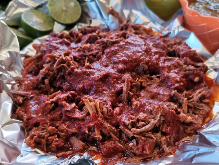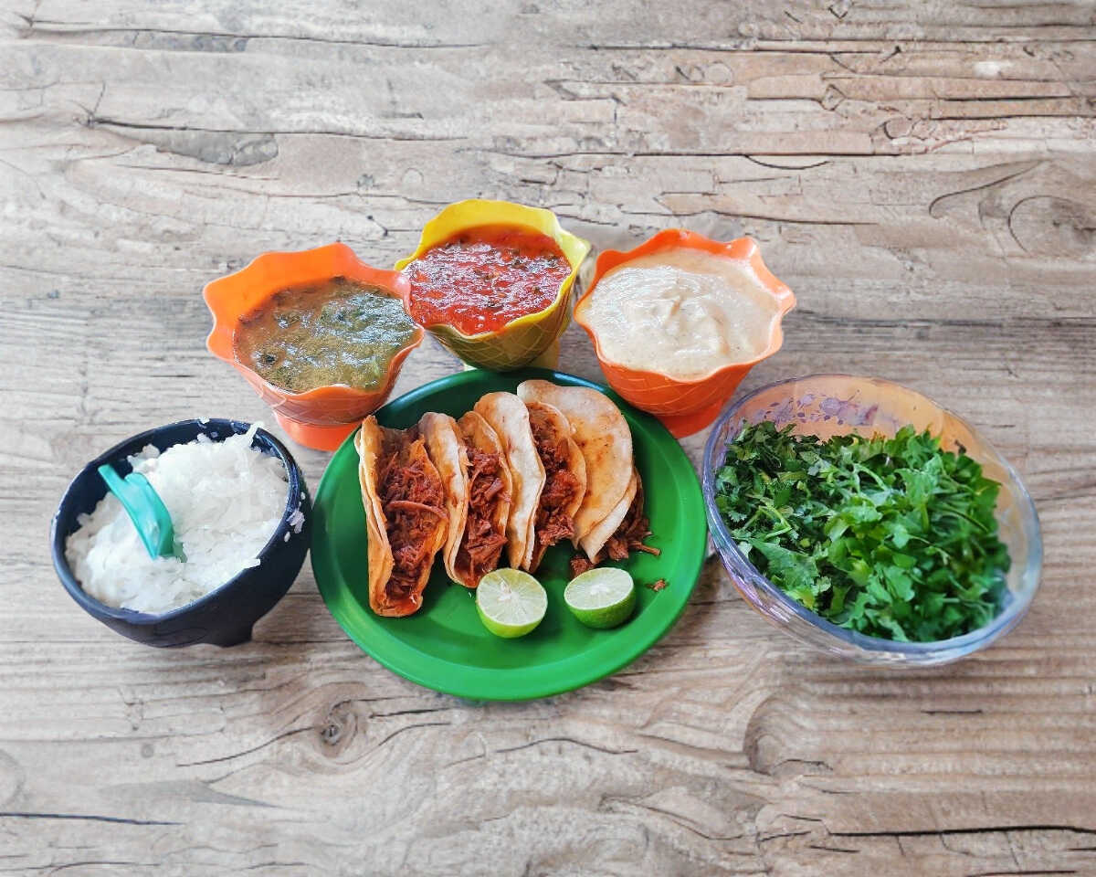 Exquisita barbacoa adobada incluye todas nuestras salsas, cebolla /cilantro, limones.