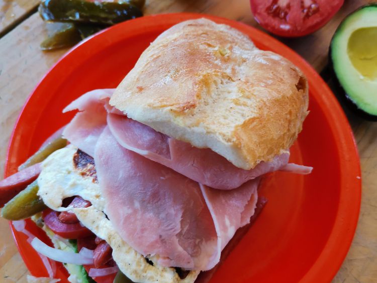 Jamon salchicha y queso hecha a la plancha ingredientes, aguacate, jitomate, cebolla, mayonesa, mostaza y chiles en vinagre.