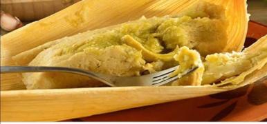 Tamal en salsa verde (empacado de forma tradicional en hojas de maíz).