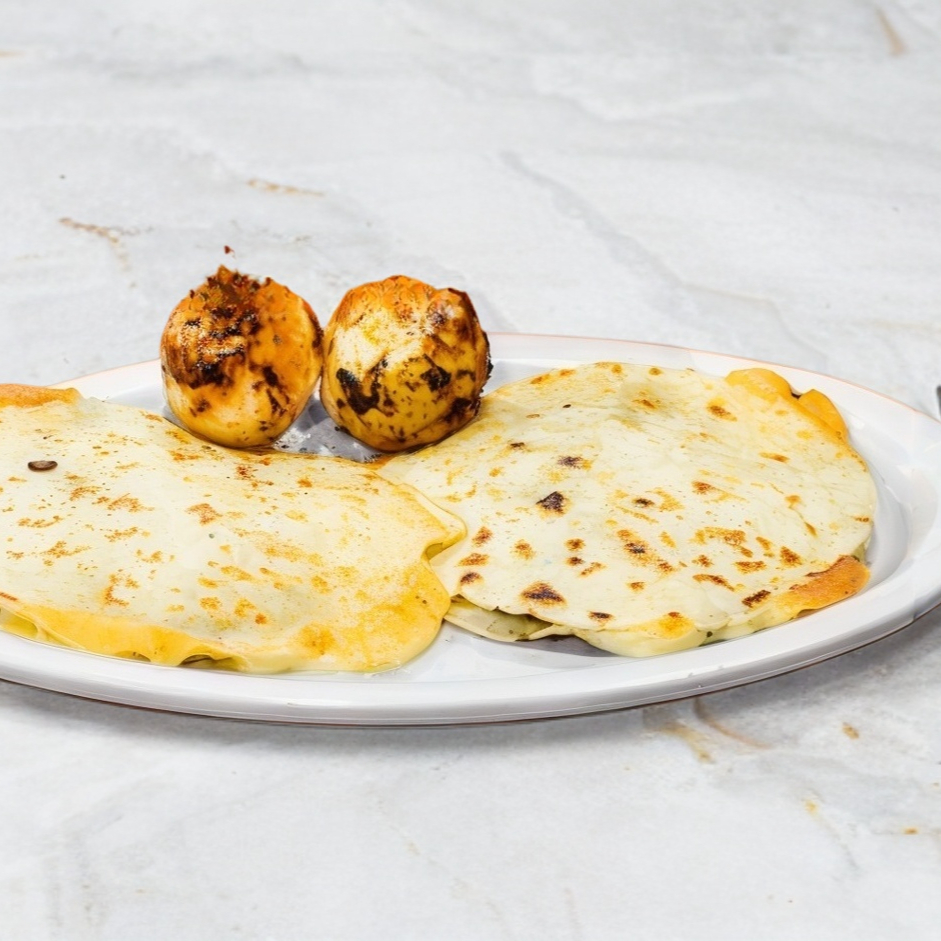 Dos tortillas recién echas tamaño grande, con queso y carne