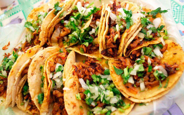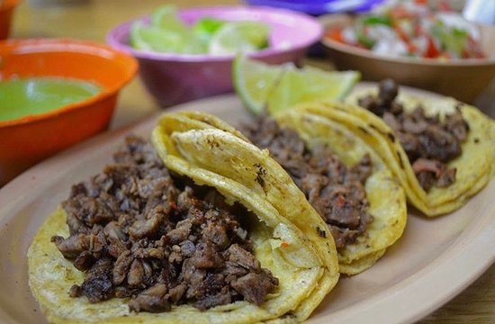 Carne de res, pico de gallo, tortilla de maiz, salsa roja de tomate, queso mozzarella.