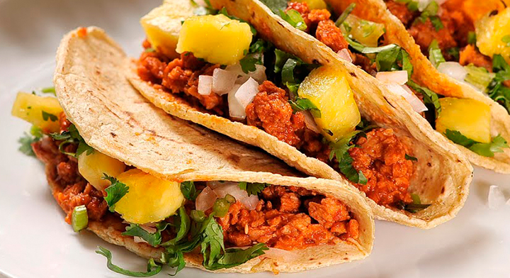 Carne de res, pico de gallo, tortilla de maíz, salsa roja de tomate, queso mozzarella.