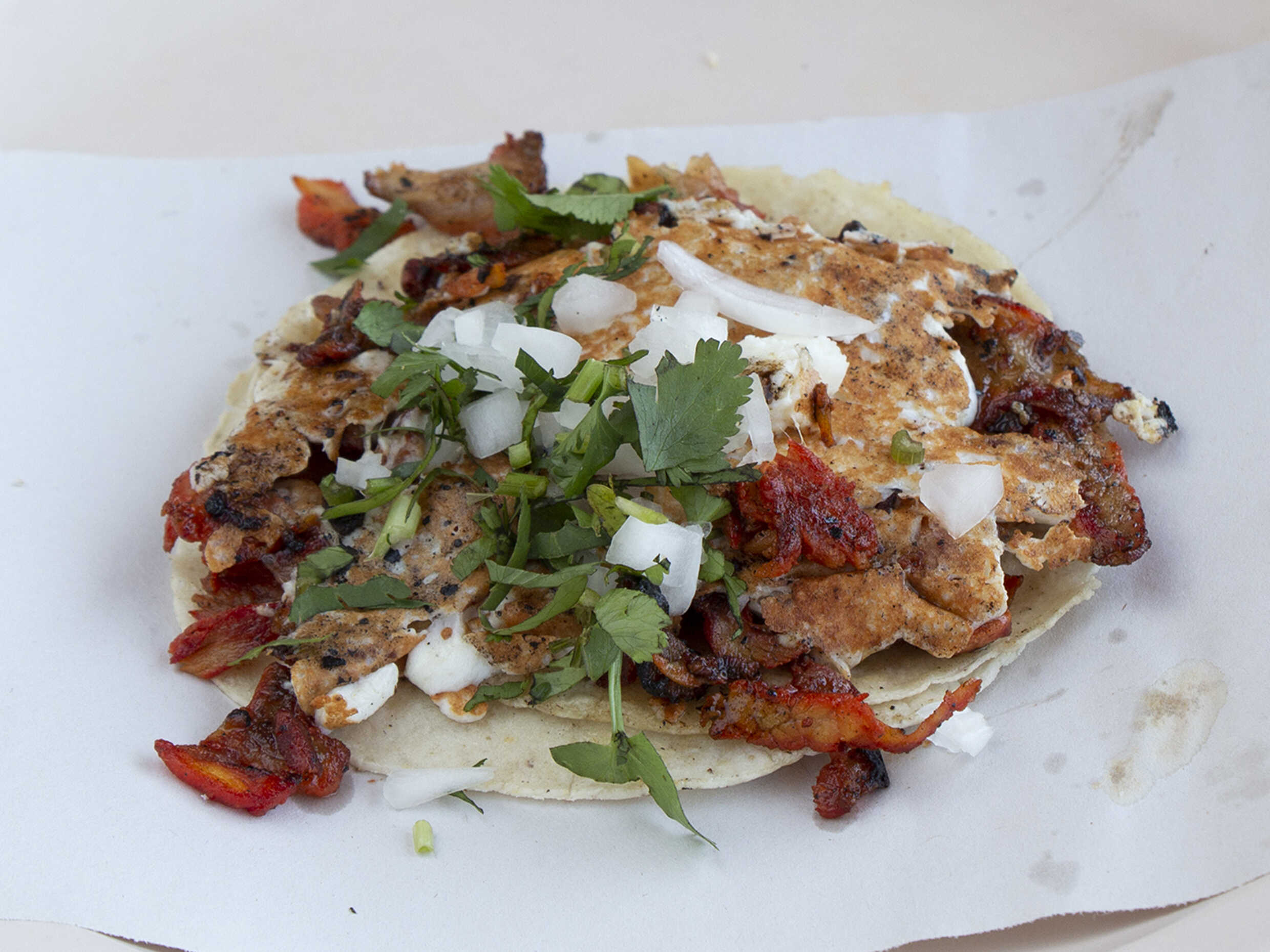 Tortilla con carne al pastor, cebolla y cilantro.