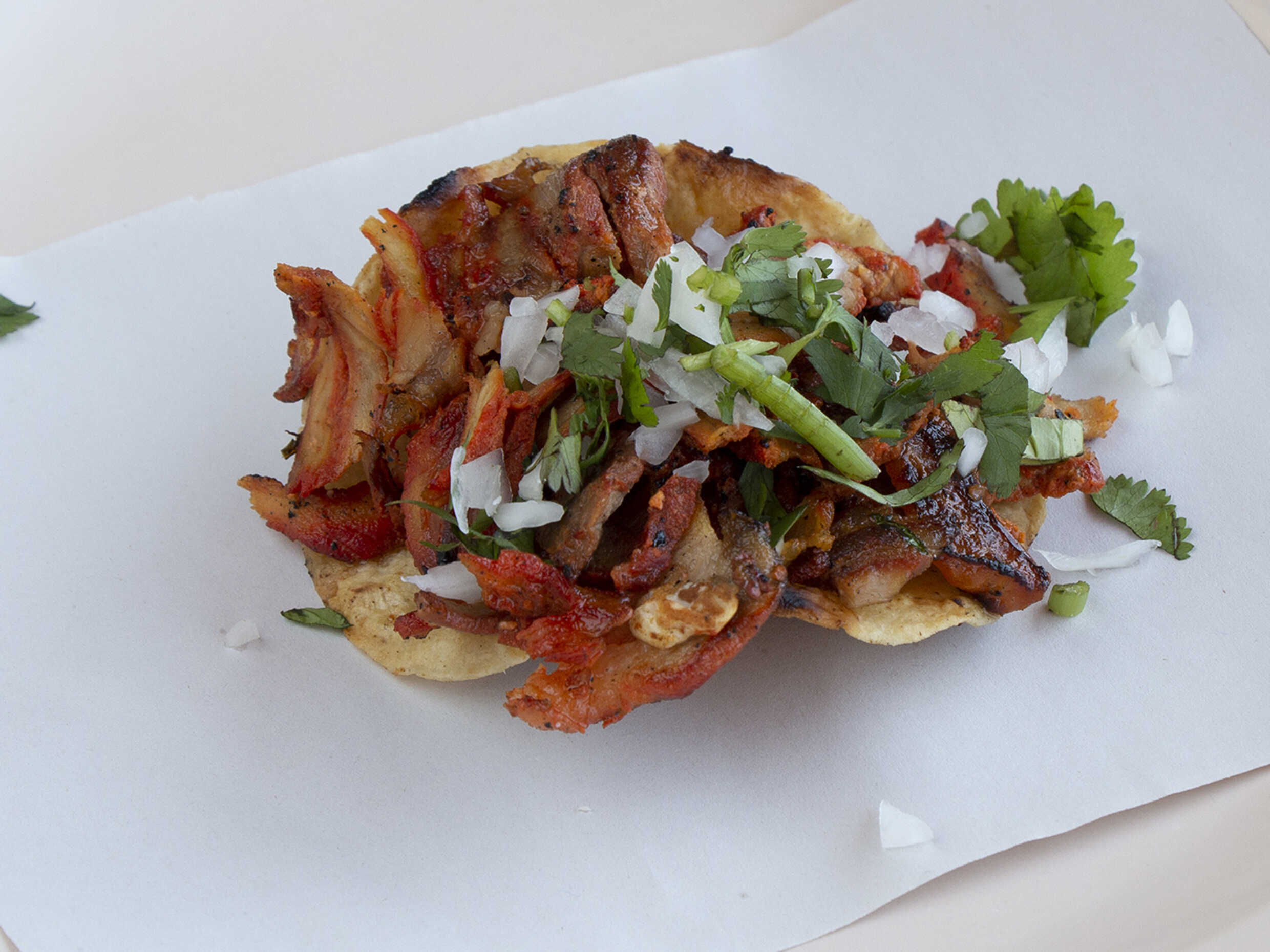 Tostada con carne de pastor, cebolla y cilantro