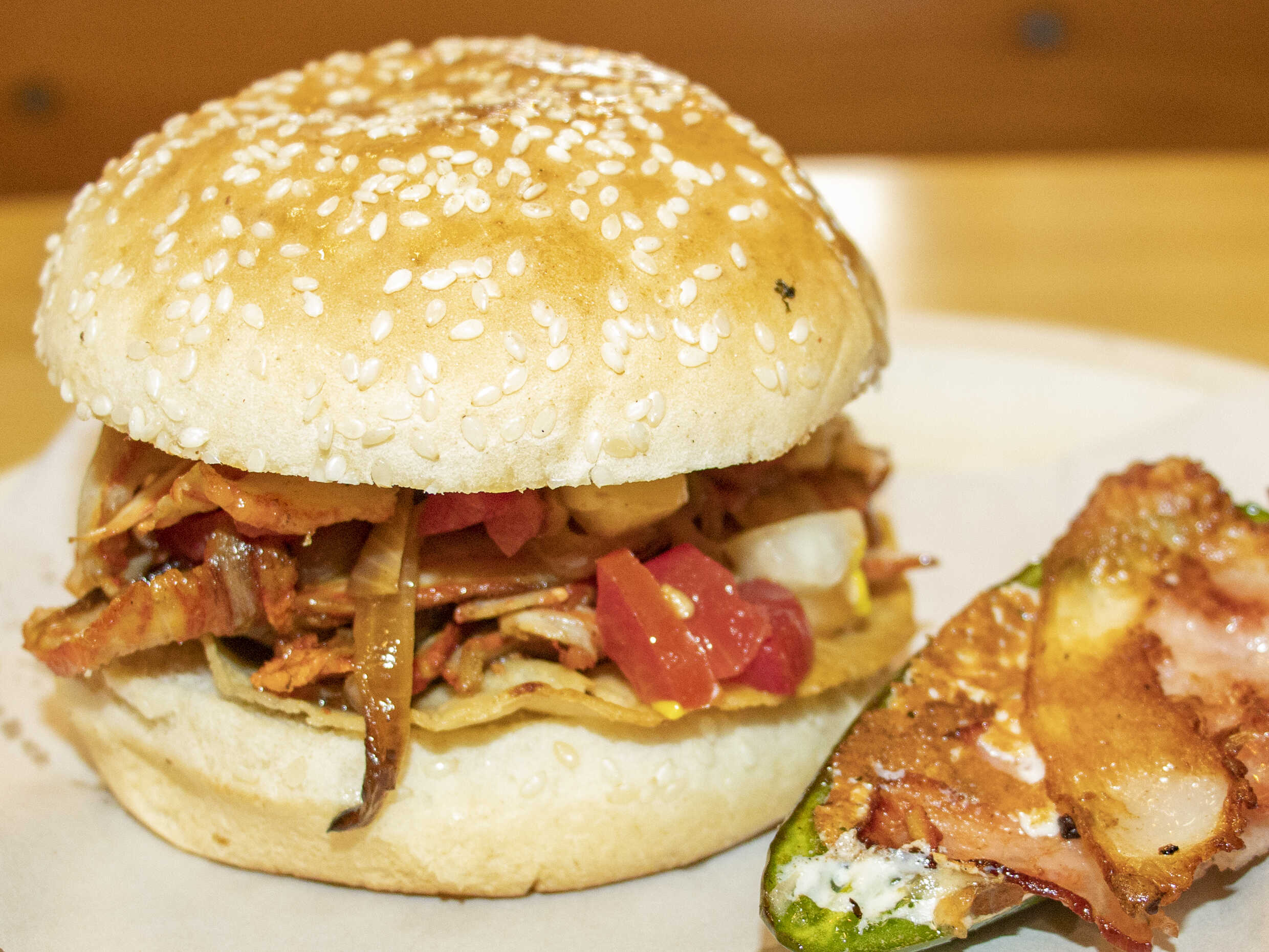 Chile jalapeño asado relleno de queso y envuelto con tocino.
