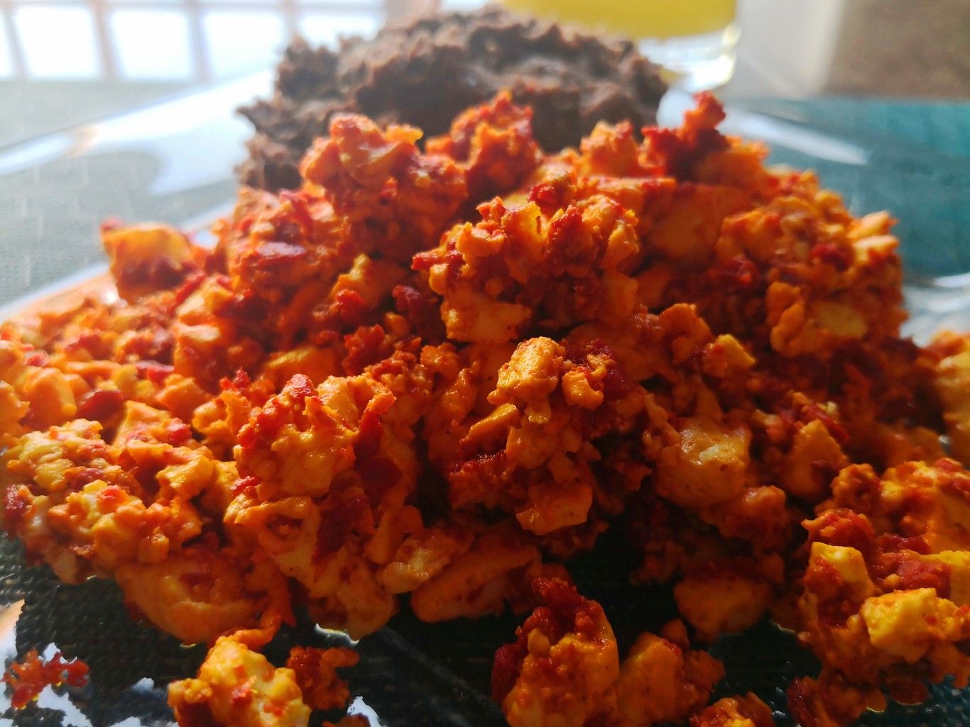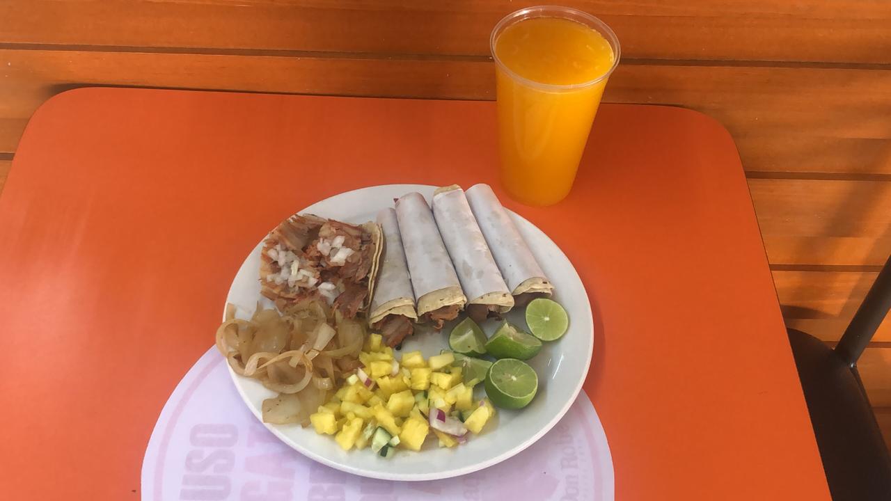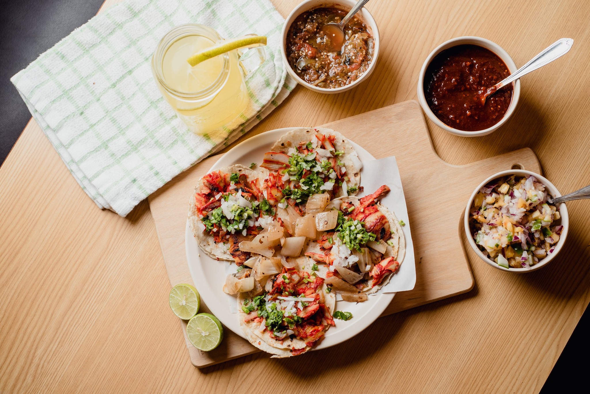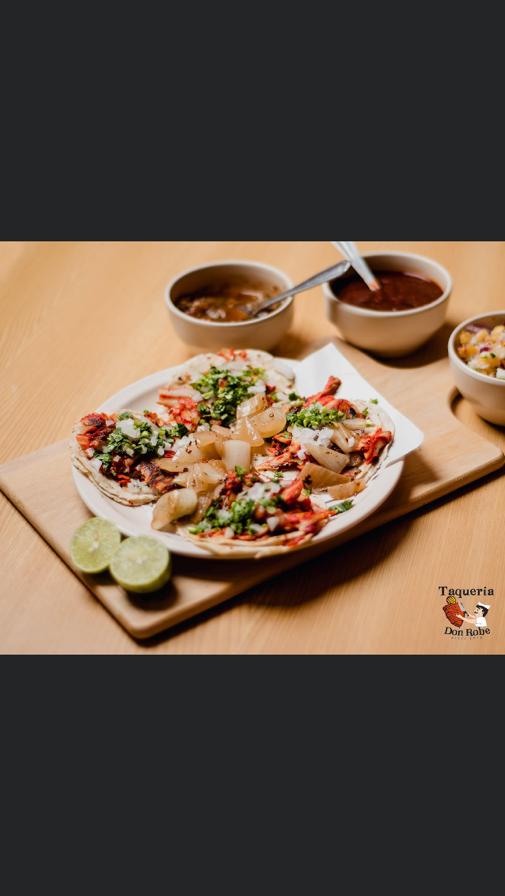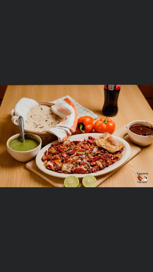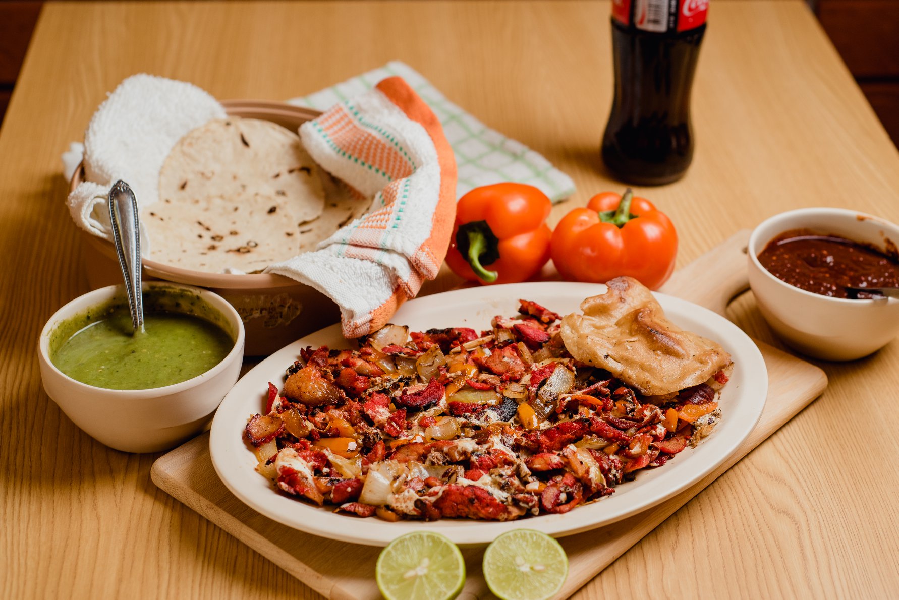 Carne al pastor con queso fundido, chile morrón picado, cebolla asada, acompañada de tortillas de maíz