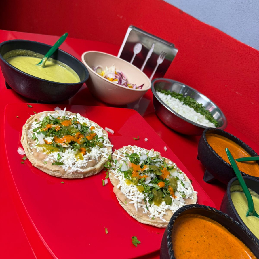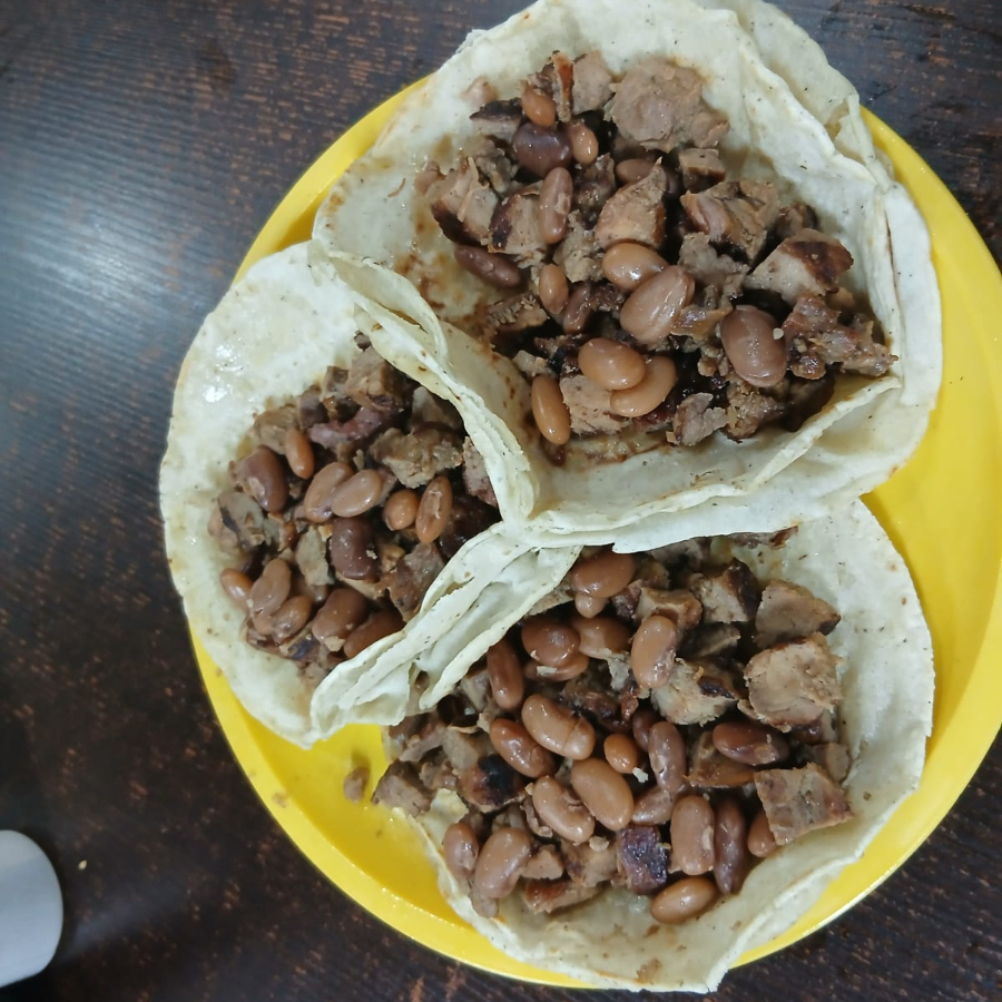 Tortilla de maíz pequeña y gruesa, con frijoles, queso y carne de res.