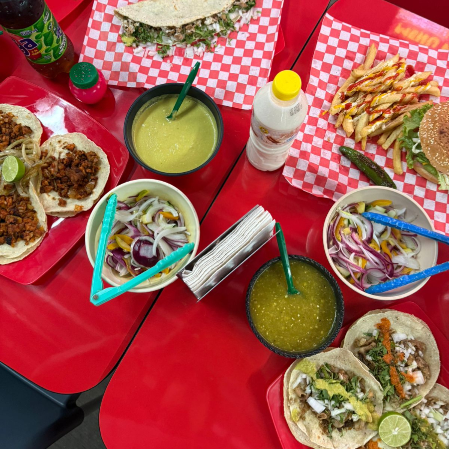 Carne de res, carne al pastor adobada, queso americano, lechuga, tomate, cebolla.