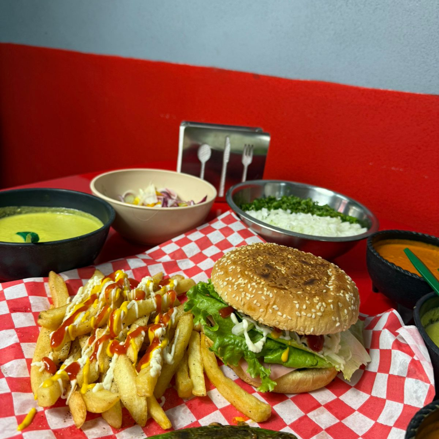 Jugosa carne de res, queso americano, lechuga, tomate, cebolla.