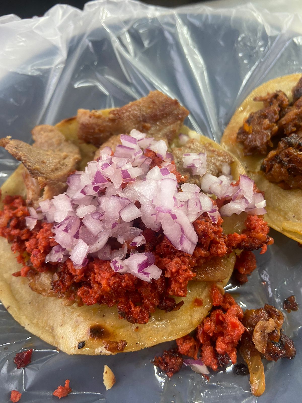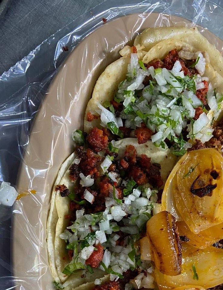 Bistec, chorizo, tortilla de maíz chica, cebolla y cilantro.