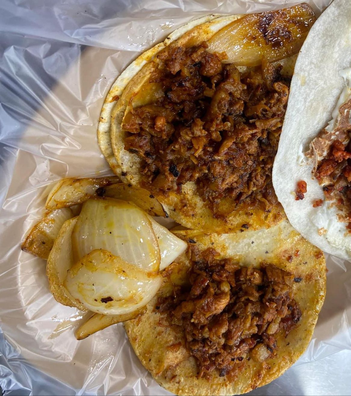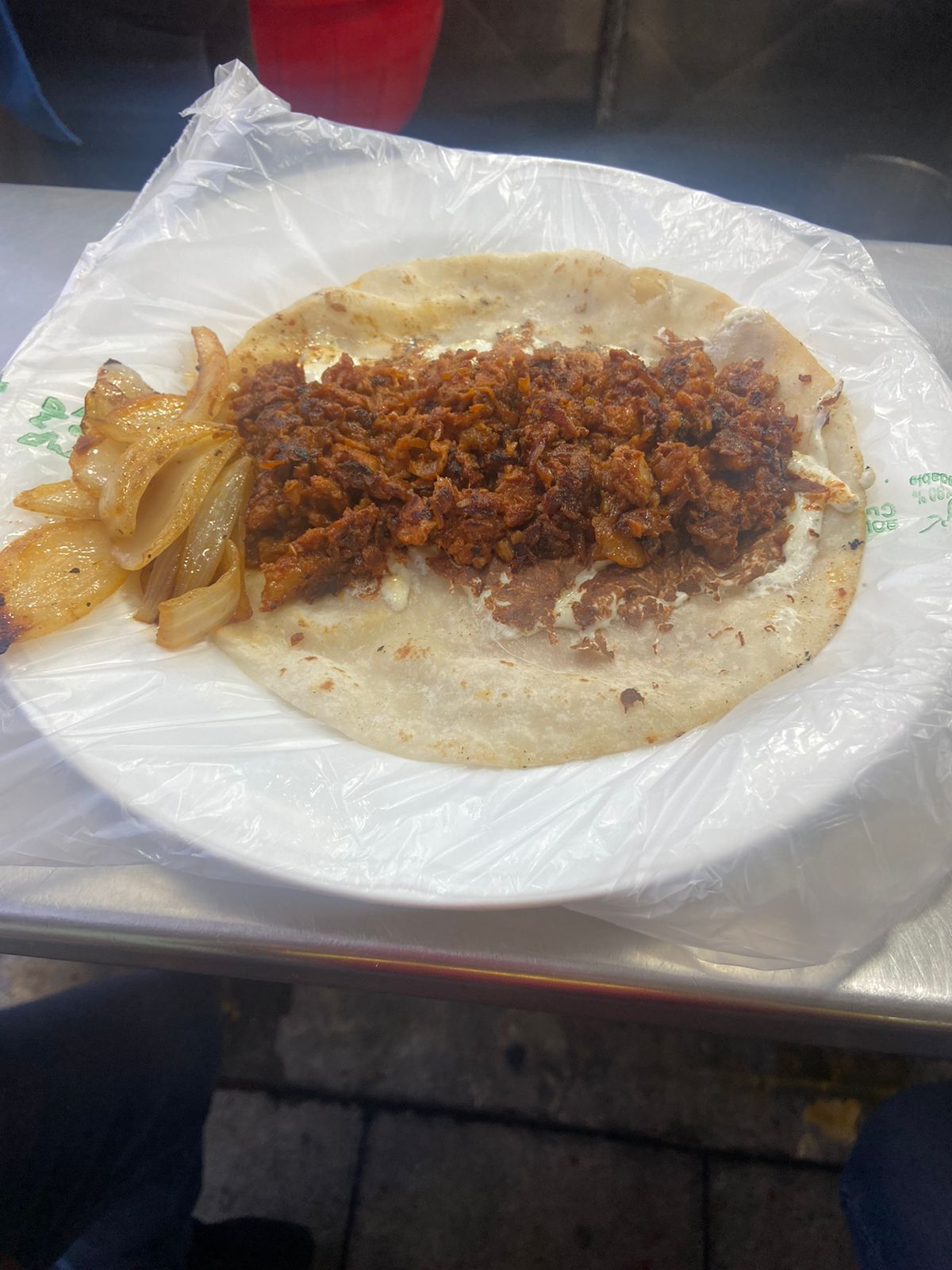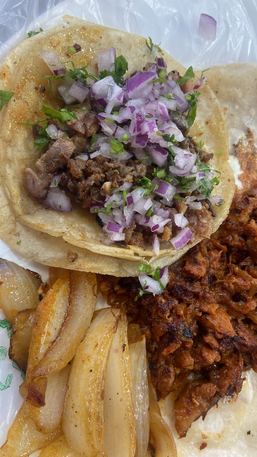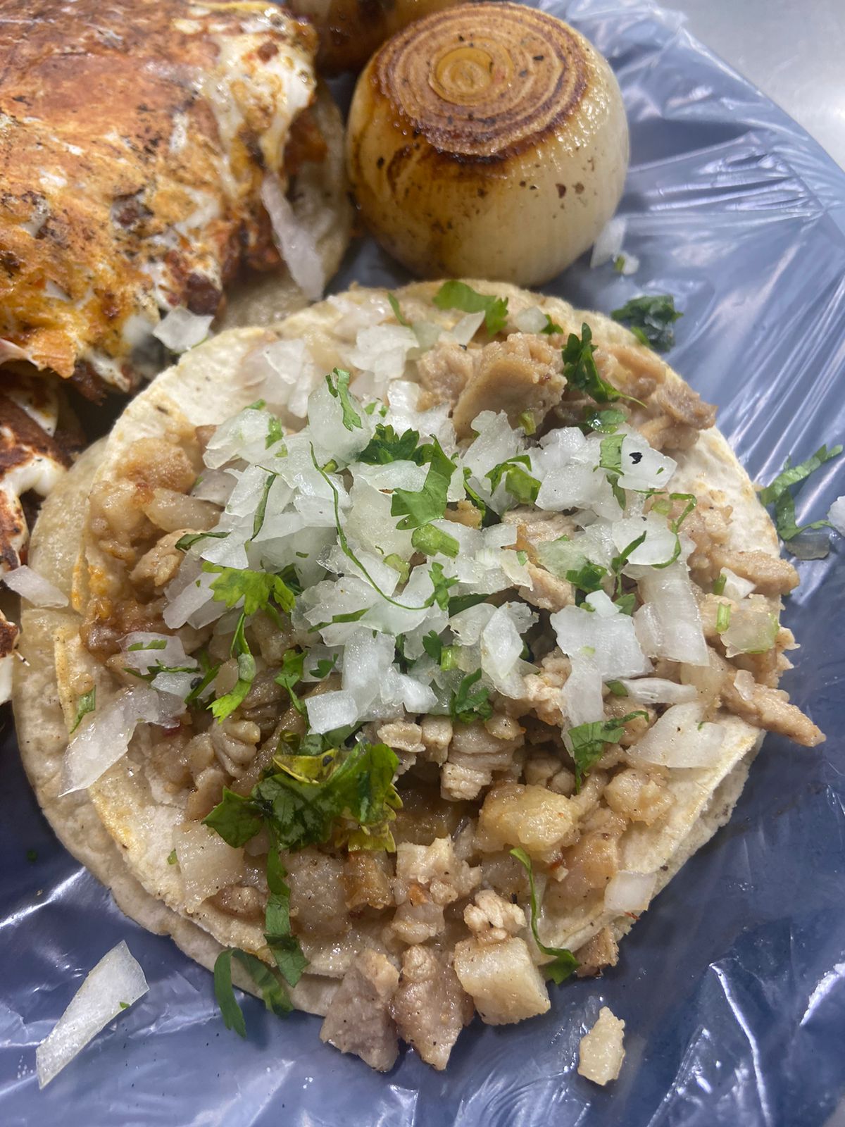 Carne, tortilla de maíz chica, cebolla y cilantro.