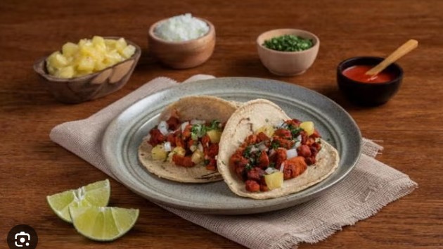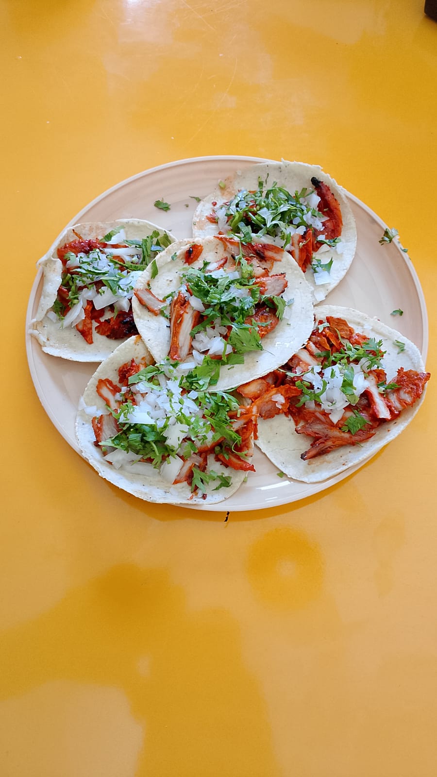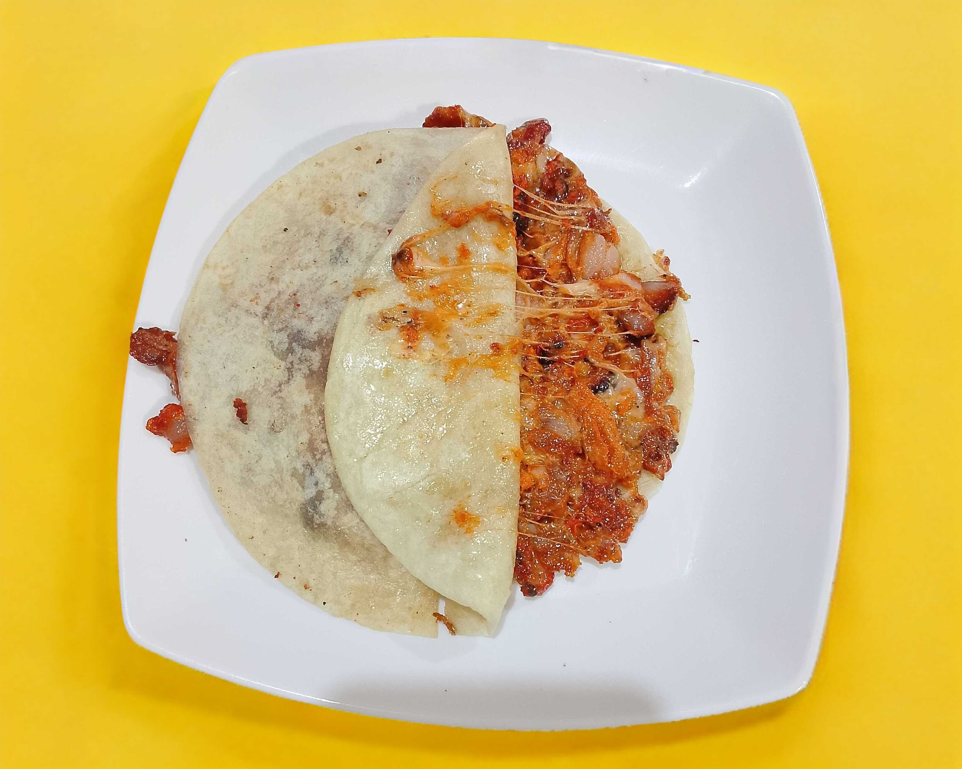 Carne estilo pastor, en tortilla de comal con queso y tradicional salsa.