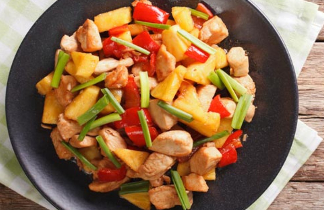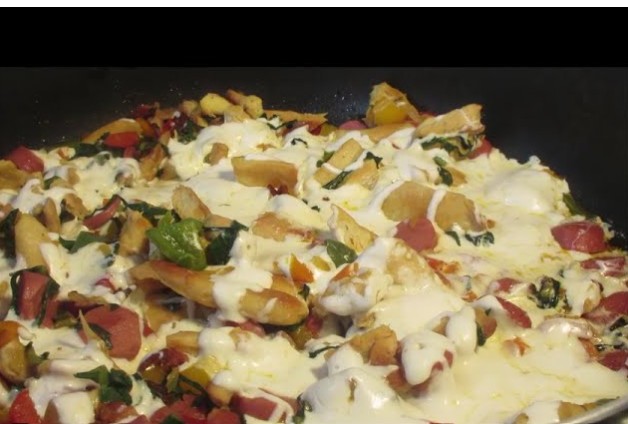 Morrón, cebolla, tocino, pollo y queso Los platillos van acompañados con tortillas, y salsas.