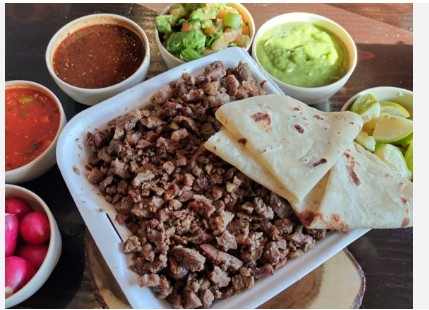 Plato de arrachera y queso, con tortilla con su tradicional salsa.