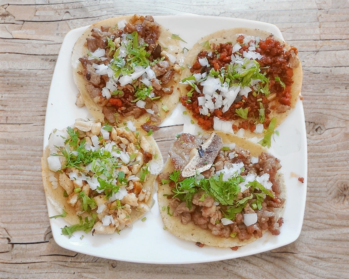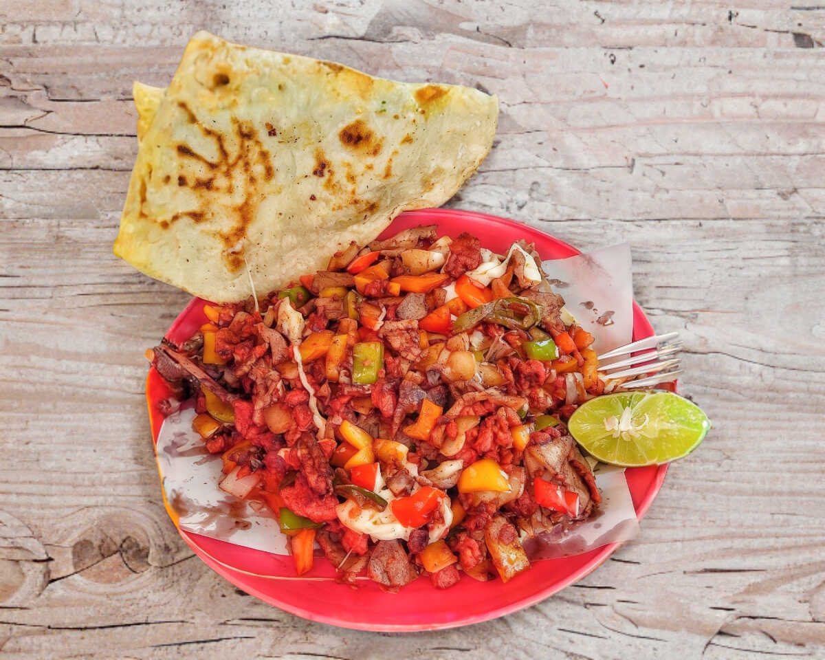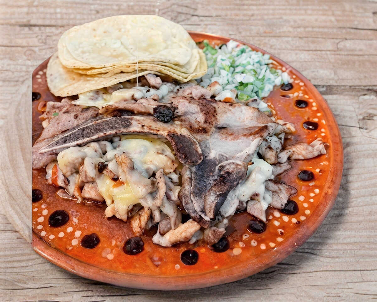 Morrón, cebolla, tocino, costilla y queso. Los platillos van acompañados con tortillas, y salsas.