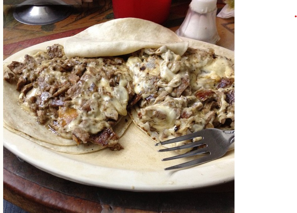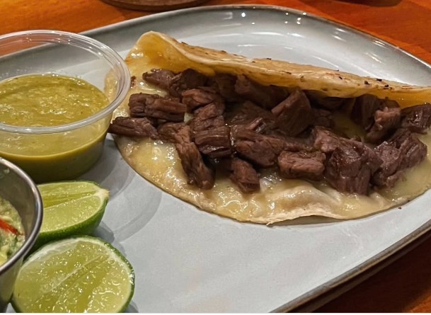 Carne Arrachera, en tortilla con queso y tradicional salsa.