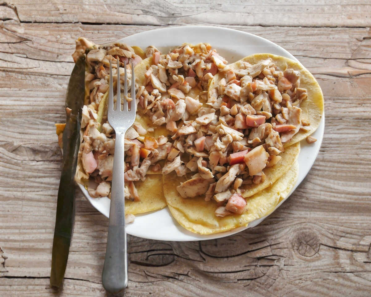 Plato de carne de pollo y queso, con tortilla con su tradicional salsa.