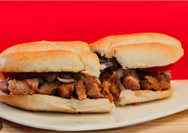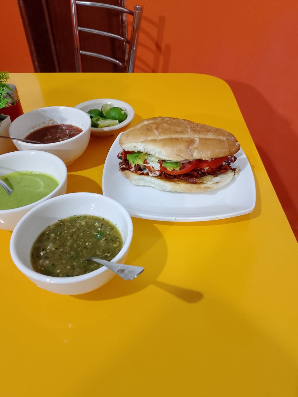 Bolillo relleno con carne al pastor piña y tocino y salsas.