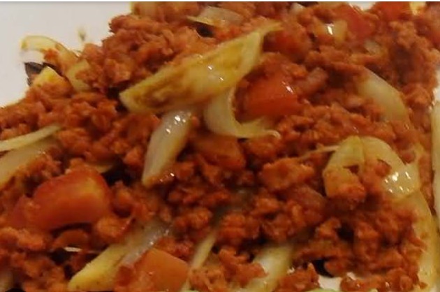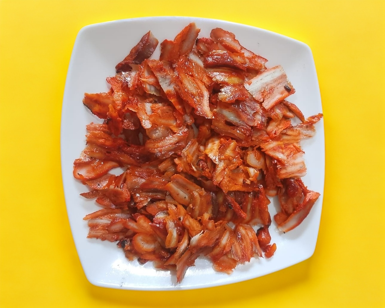 Morrón, cebolla, tocino, costilla. Los platillos van acompañados con tortillas, y salsas.