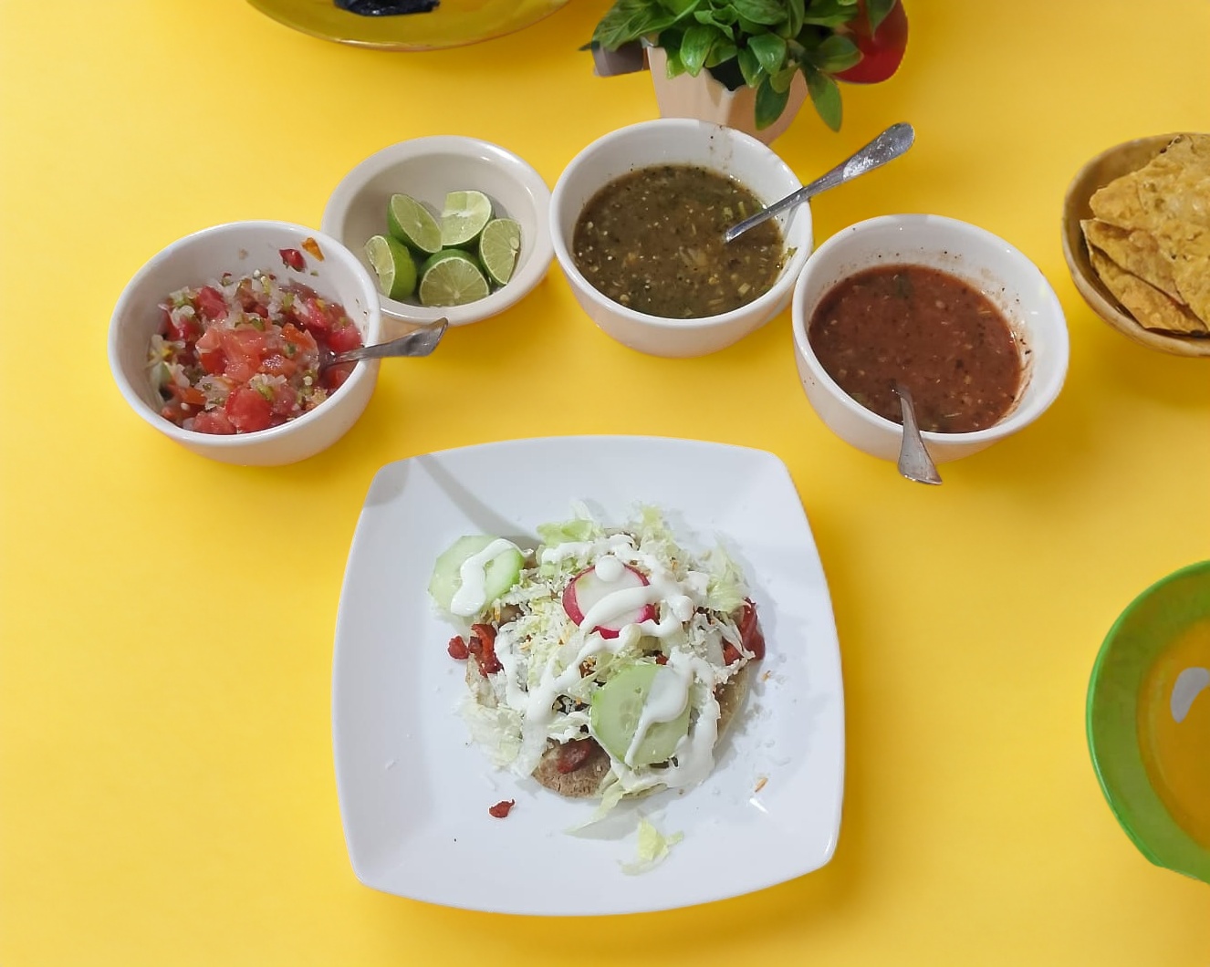 sope con base de frijol con queso salsas verdura y carne a elegir.