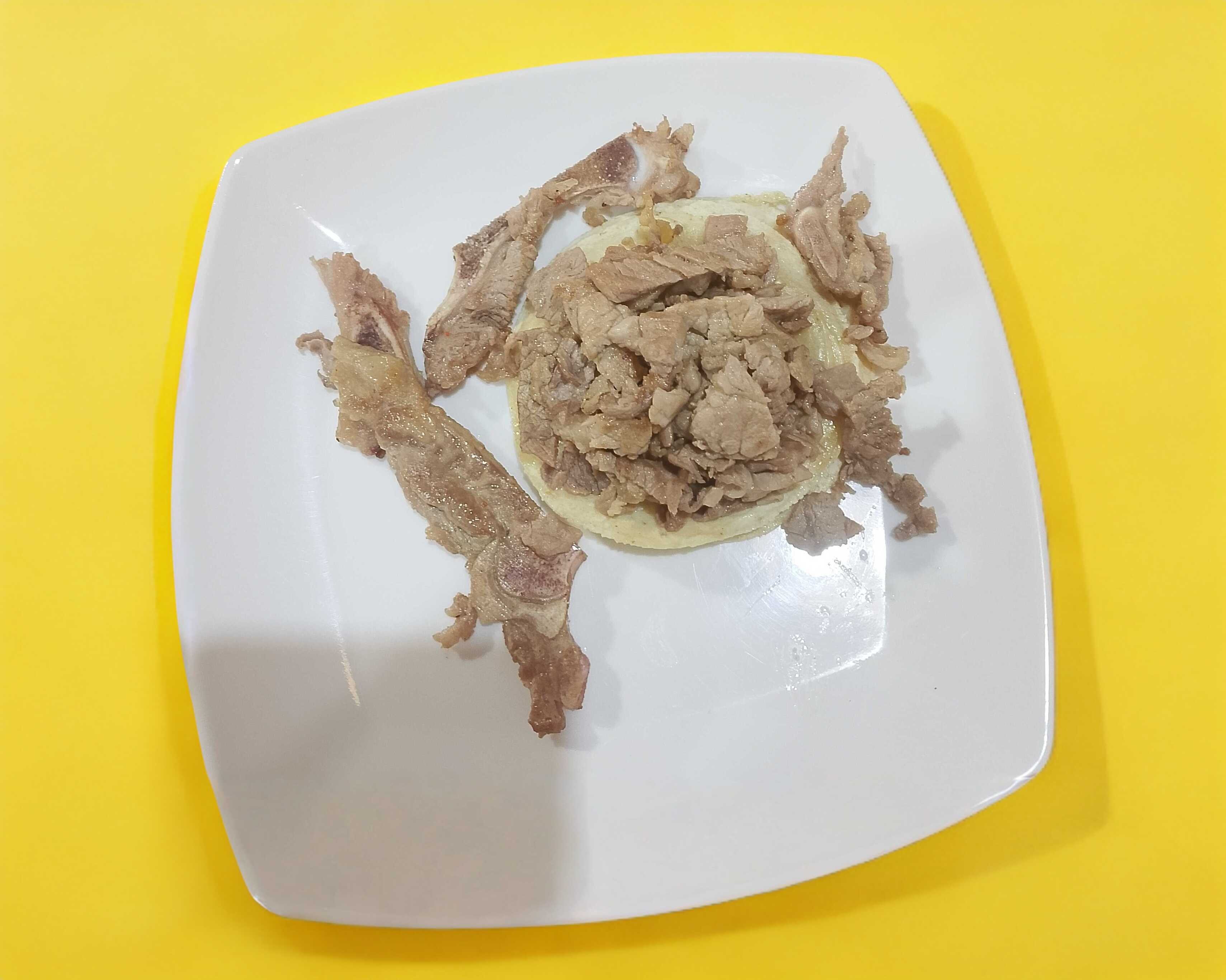 Plato de costilla y queso, con tortilla con su tradicional salsa.