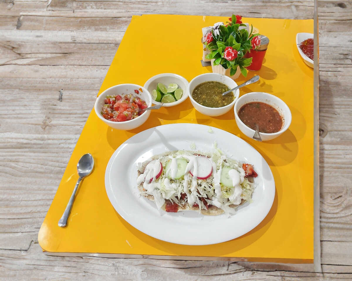 Huarache con base de frijol con queso salsas verdura y carne a elegir.
