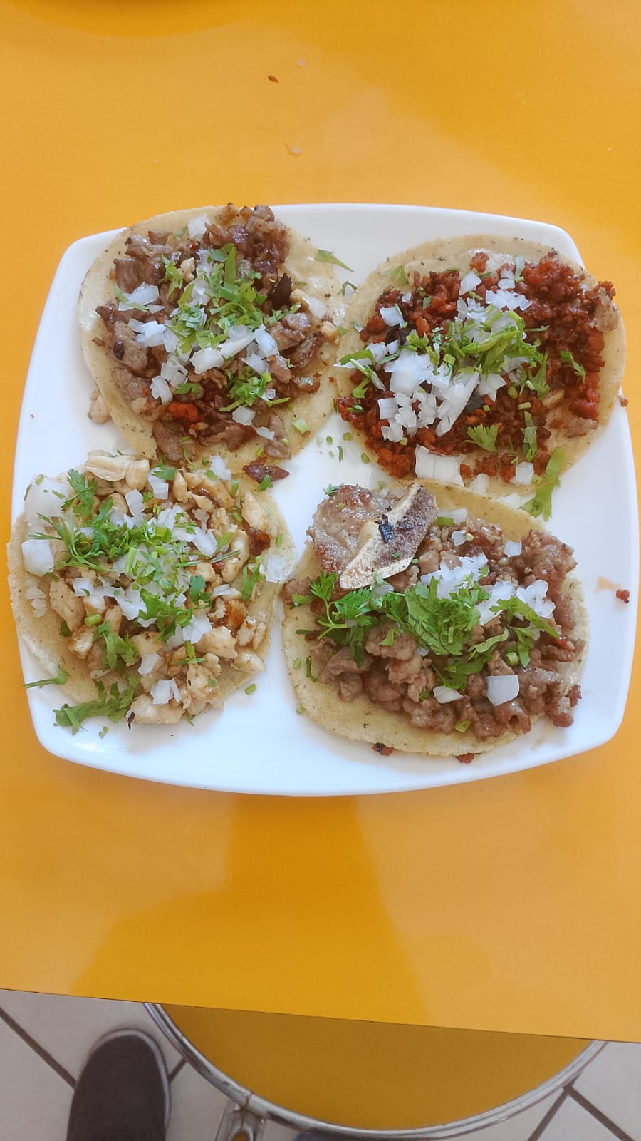 Cebolla, Morrón jamón, pastor, bistec, chuleta y queso acompañado de tortilla salsas y verdura.