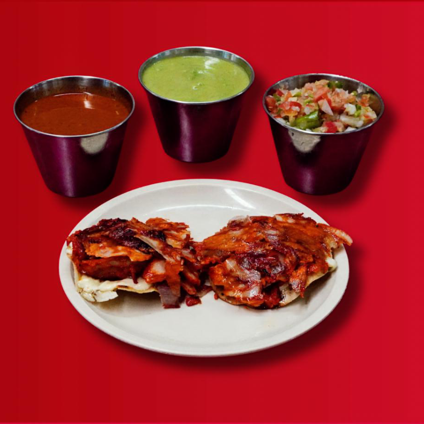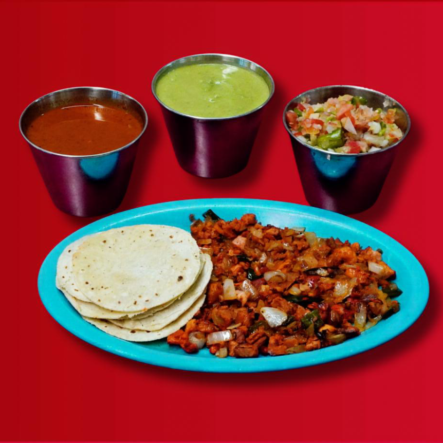 poblano, cebolla, tocino, queso, tortillas y dos carnes