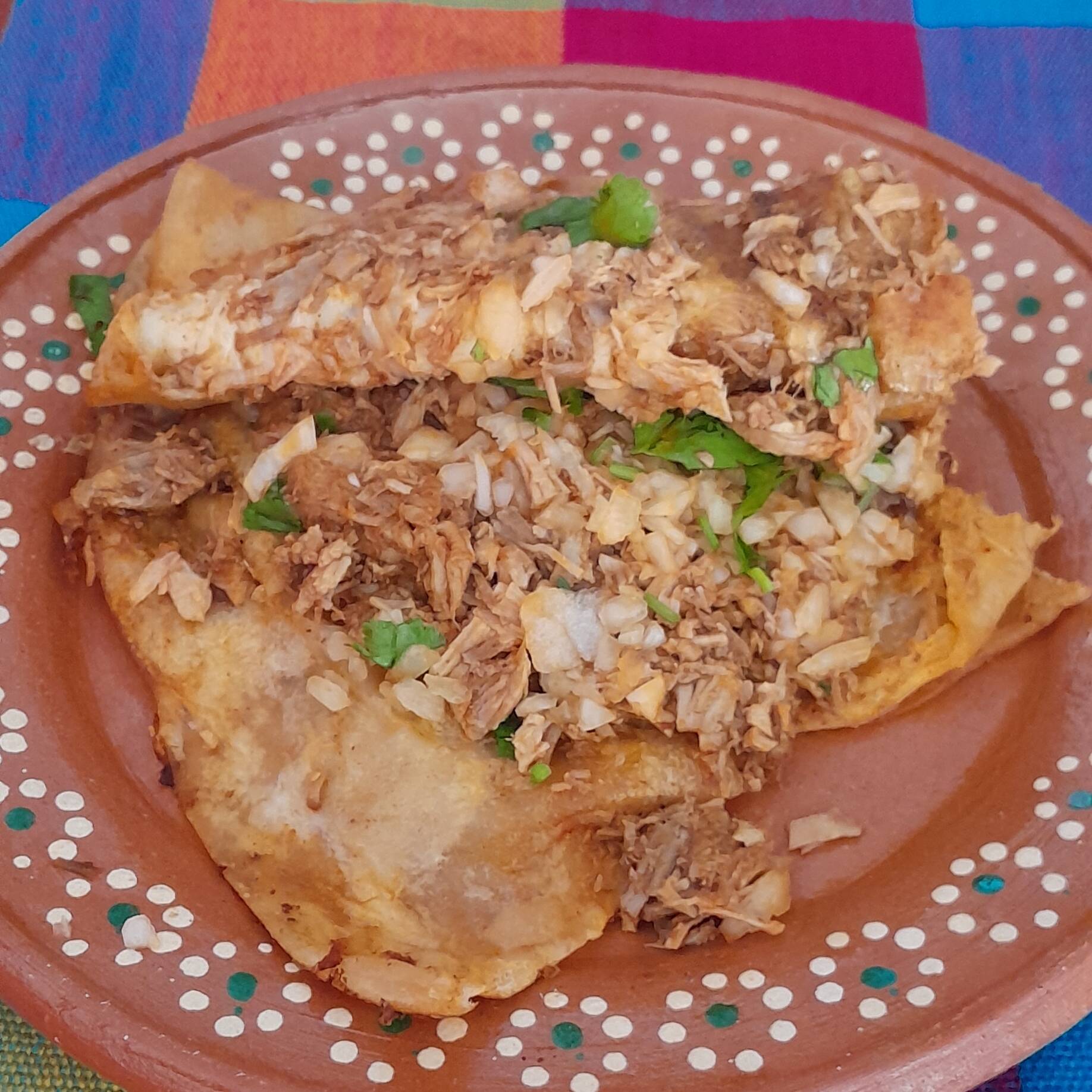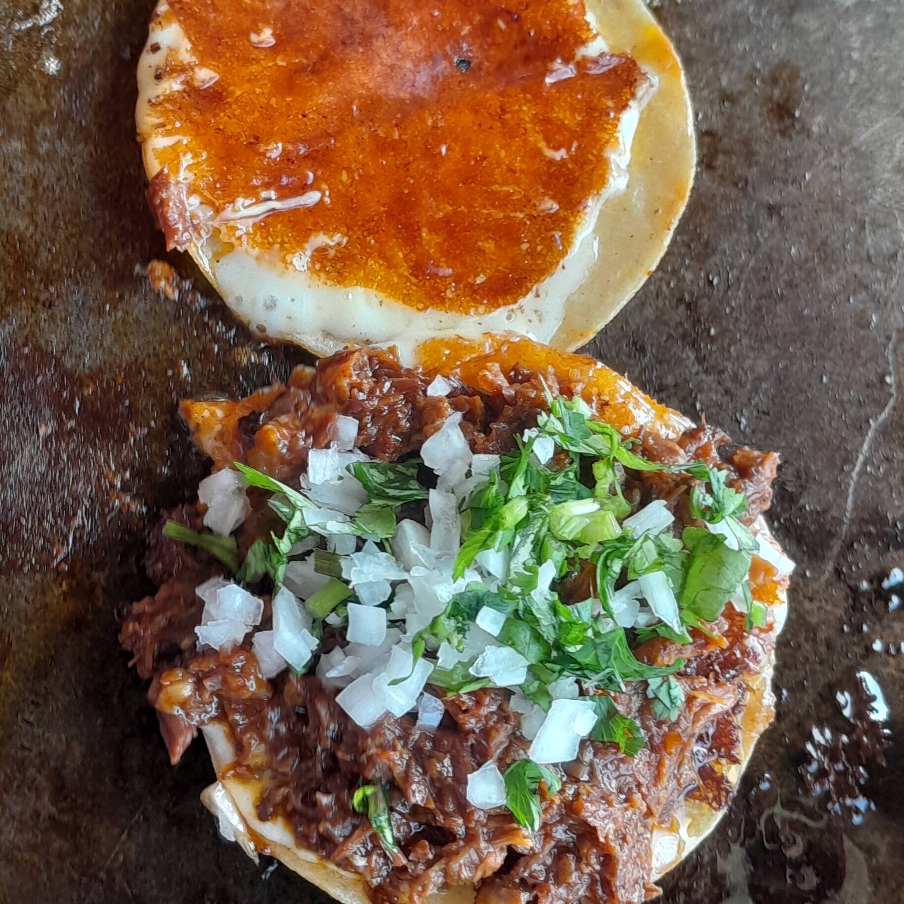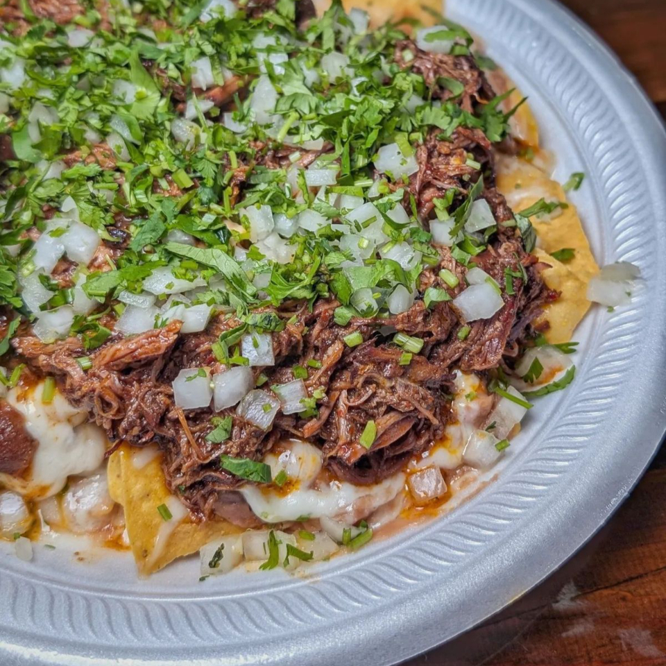 Chilaquiles en salsa roja con birria crema queso cebolla y cilantro