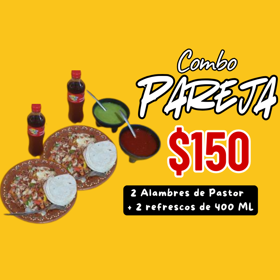 Combo Pareja: 2 Alambres de Pastor (Pastor,Morrón, cebolla, tocino y queso) + 2 refrescos de 400 ML