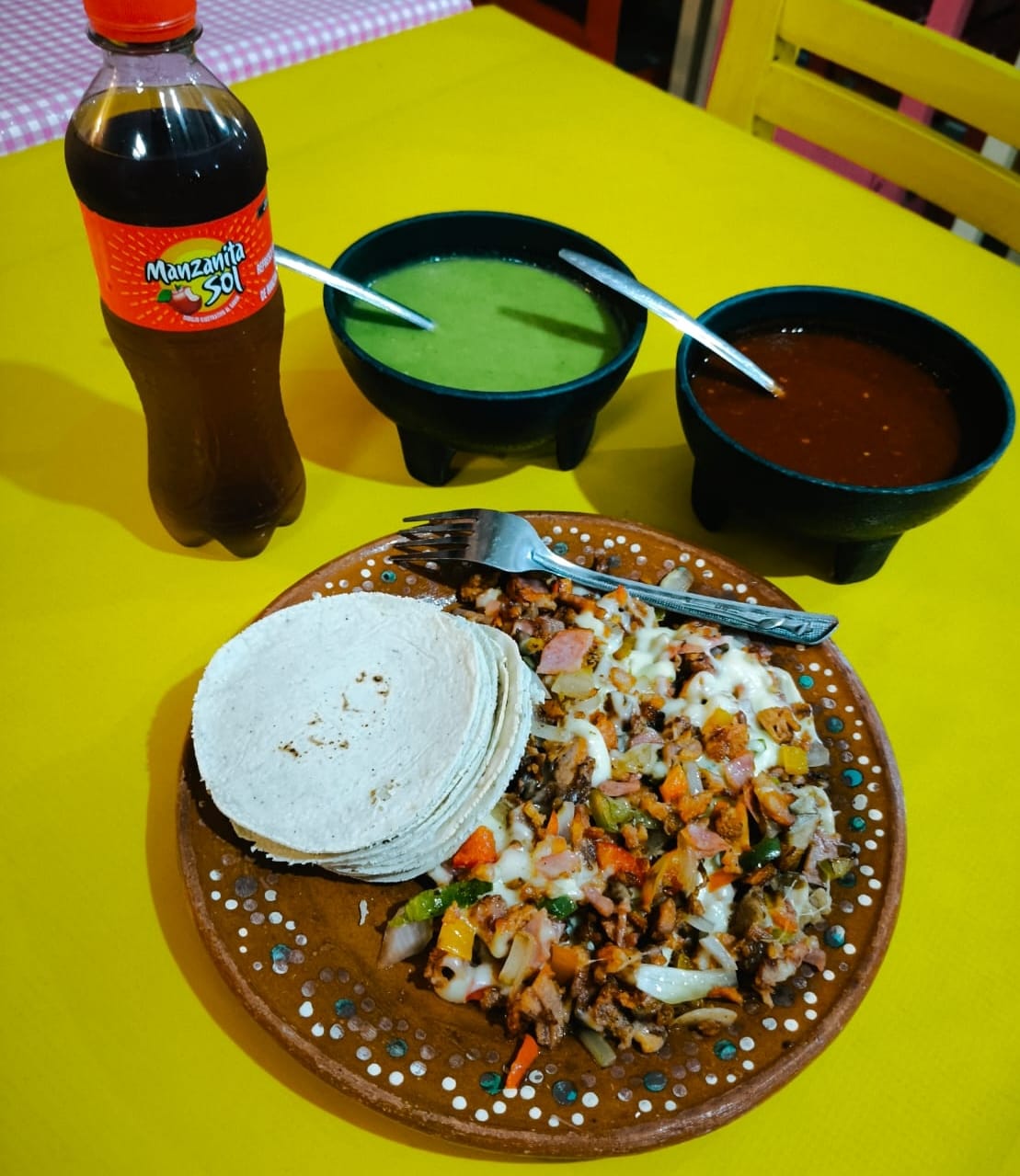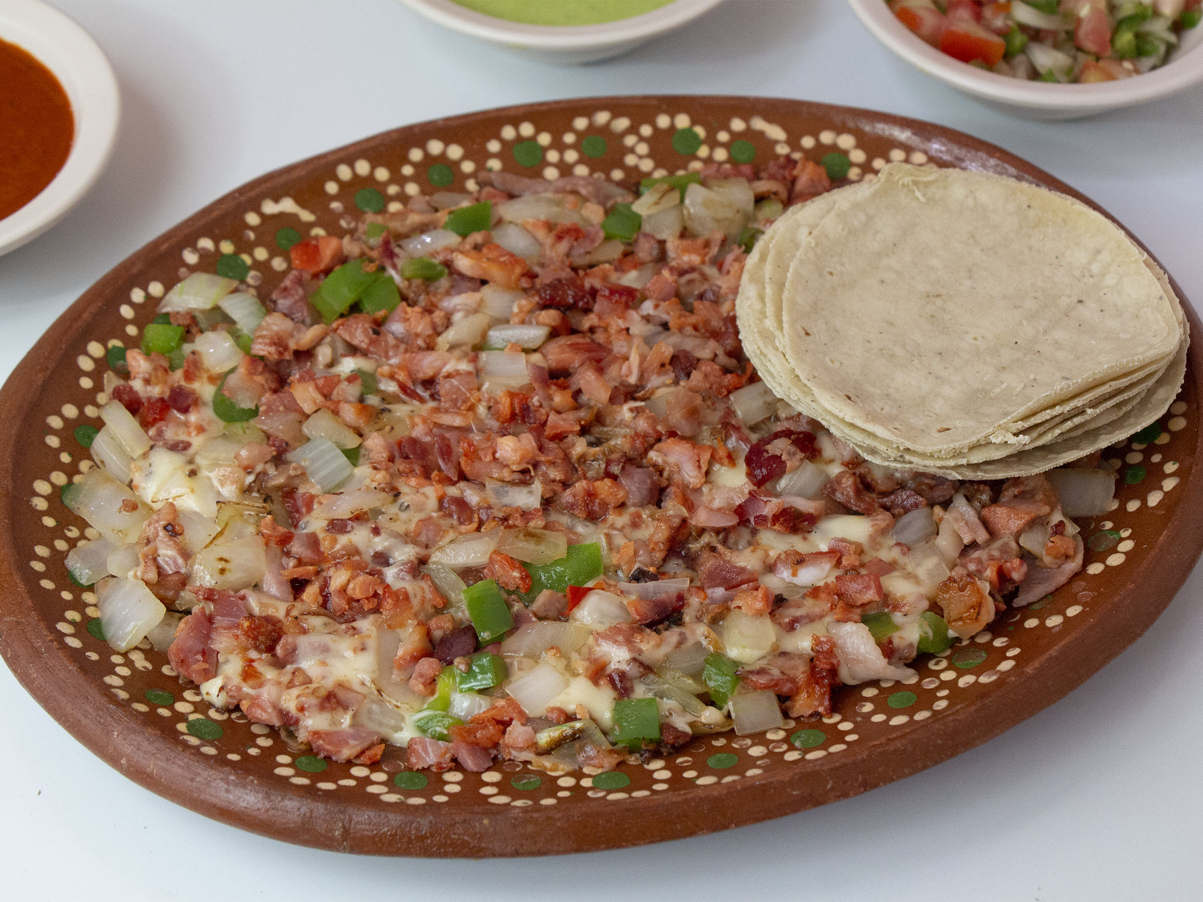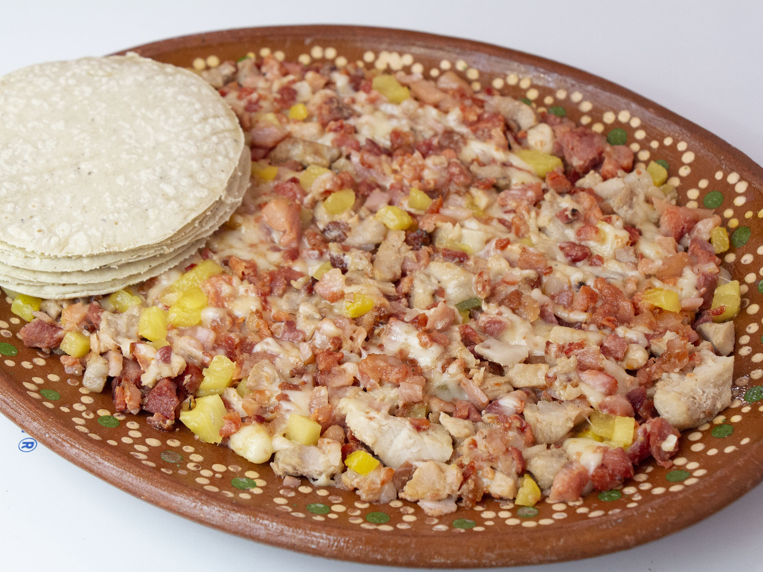Alambre Especial 12 tortillas de maiz ,Morrón, cebolla, tocino, pastor, bistec y queso asadero, salsa verde y roja