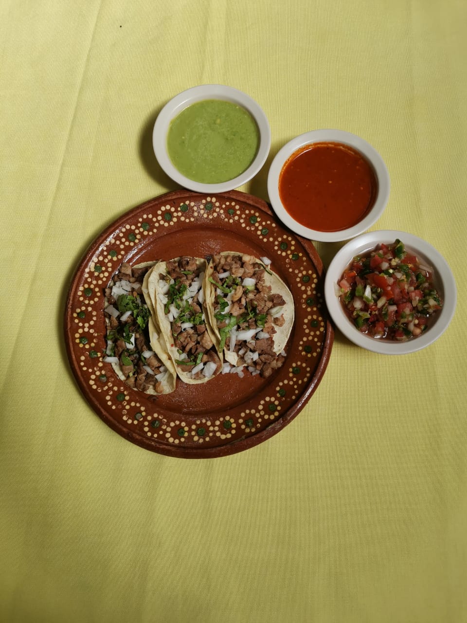 Taco Pastor (1 unidad ) tortilla de maiz pequeña 1 porción de carne al pastor (20 a 25 gramos aprox ) cebolla y cilantro, piña aparte , salsa roja o verde
