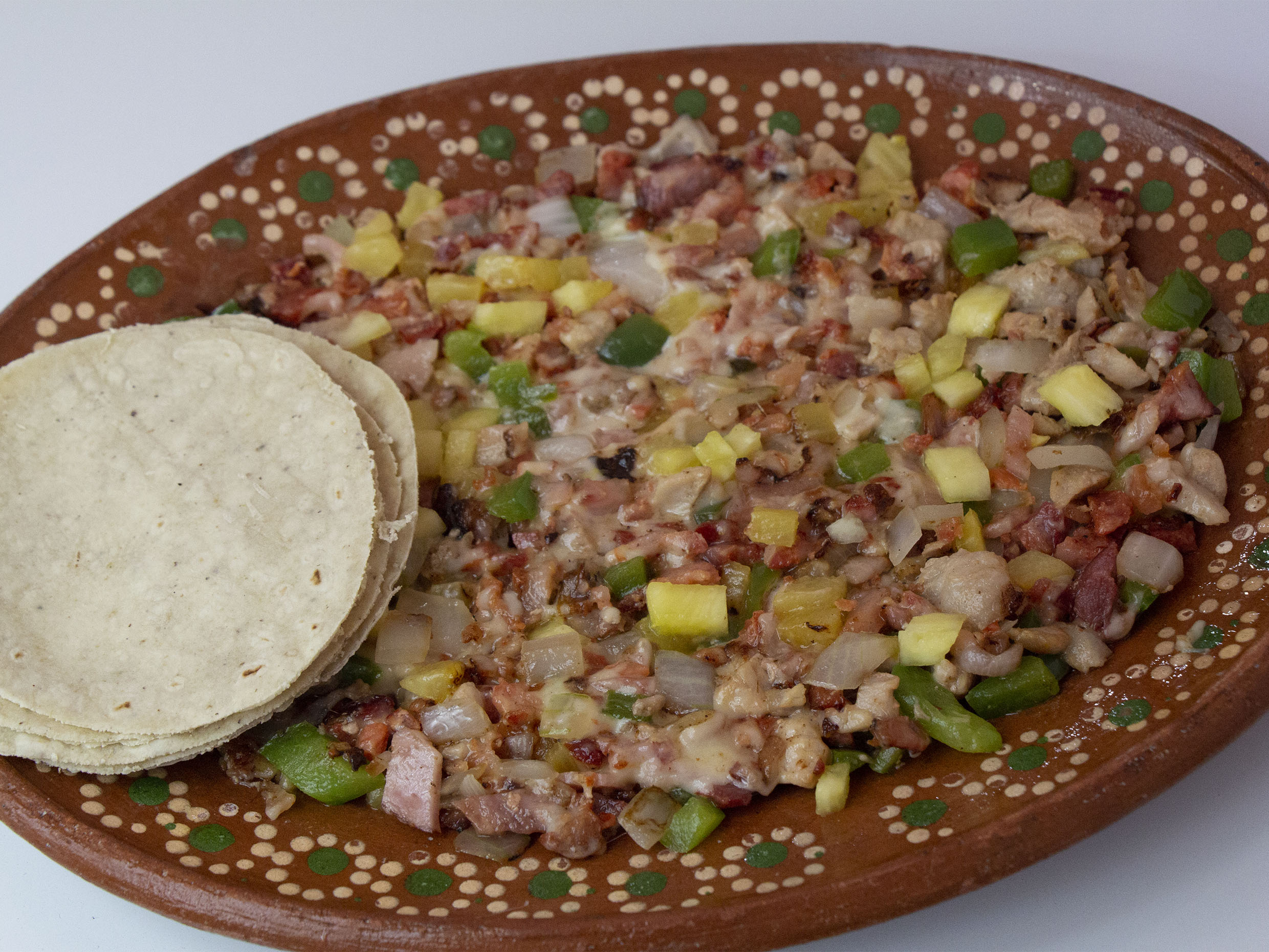 Morrón, cebolla, pastor, tocino, chuleta, bisteck, piña y queso.