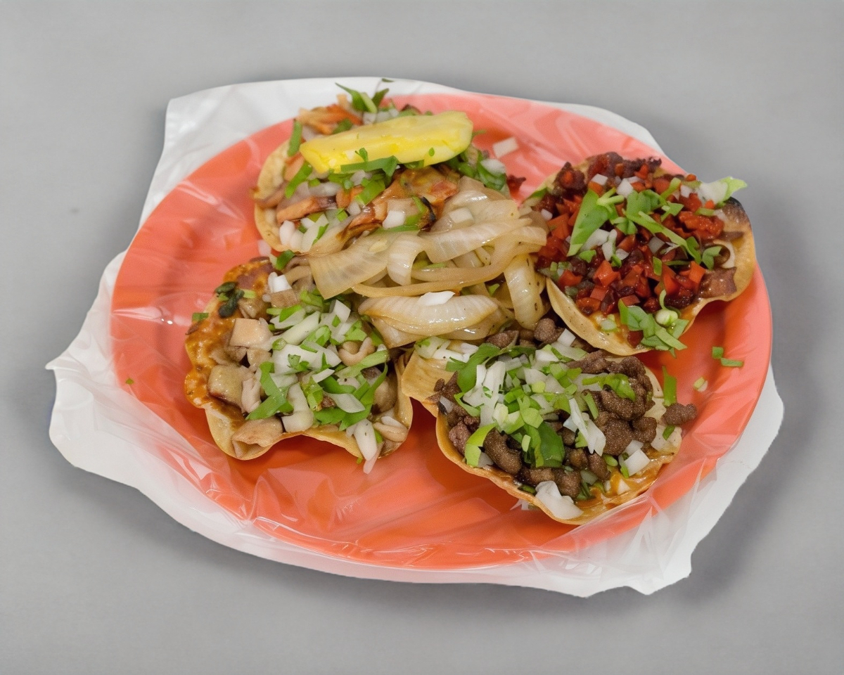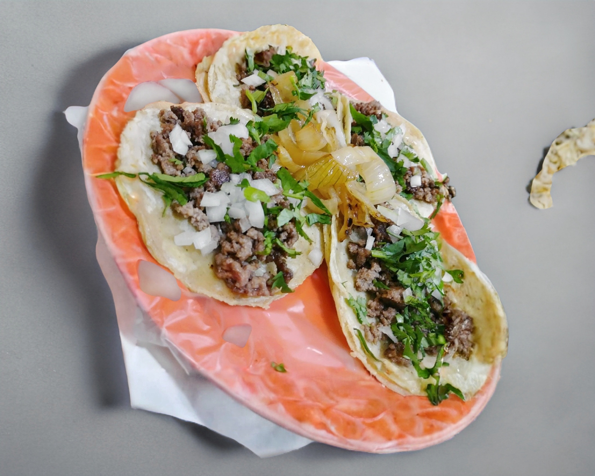 doble tortillas, carne: bistec y chorizo, cebolla y cilantro, salsa de aguacate, chipotle + limón