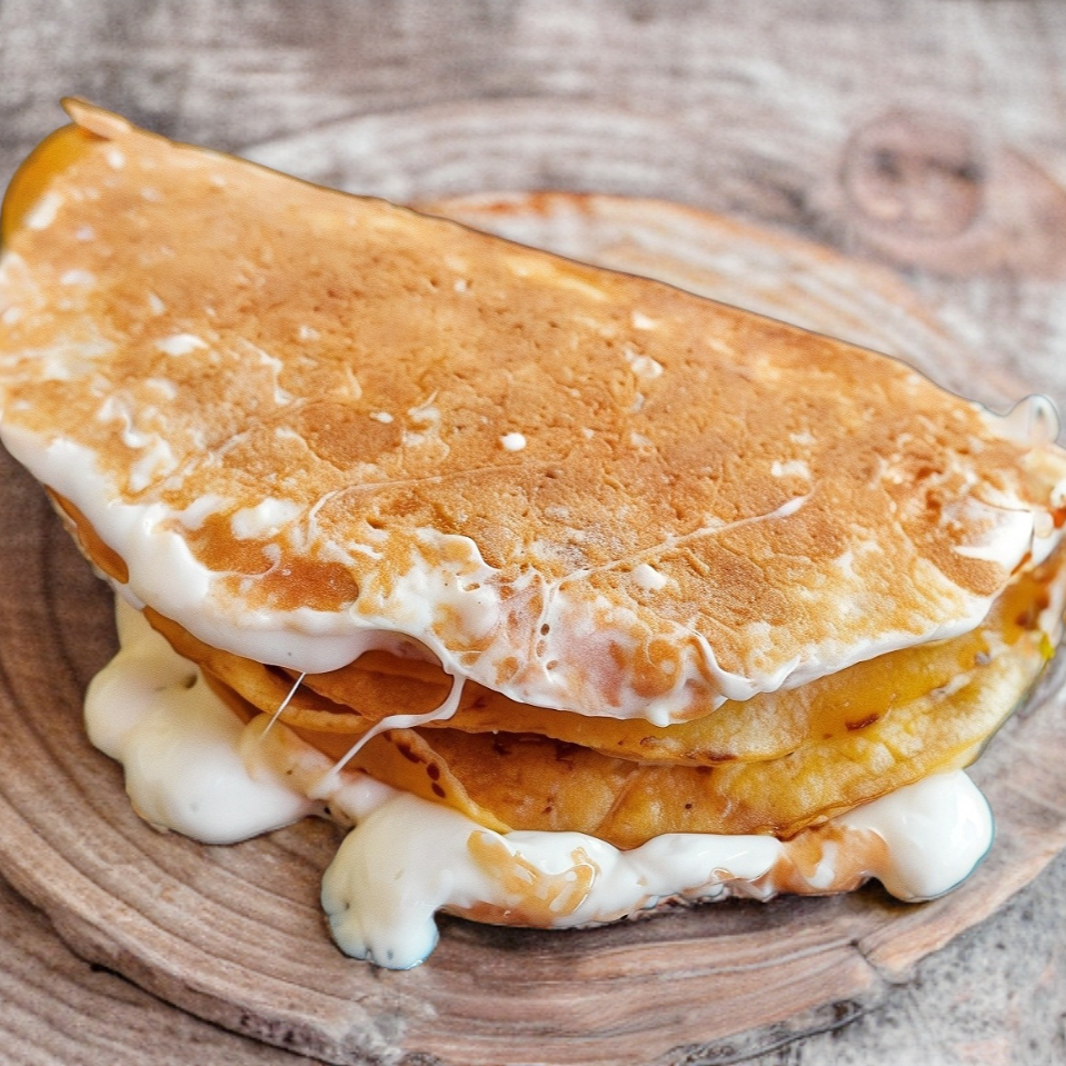Tortilla hecha a mano de aprox 30cm con queso fundido y rellena de chorizo especial.