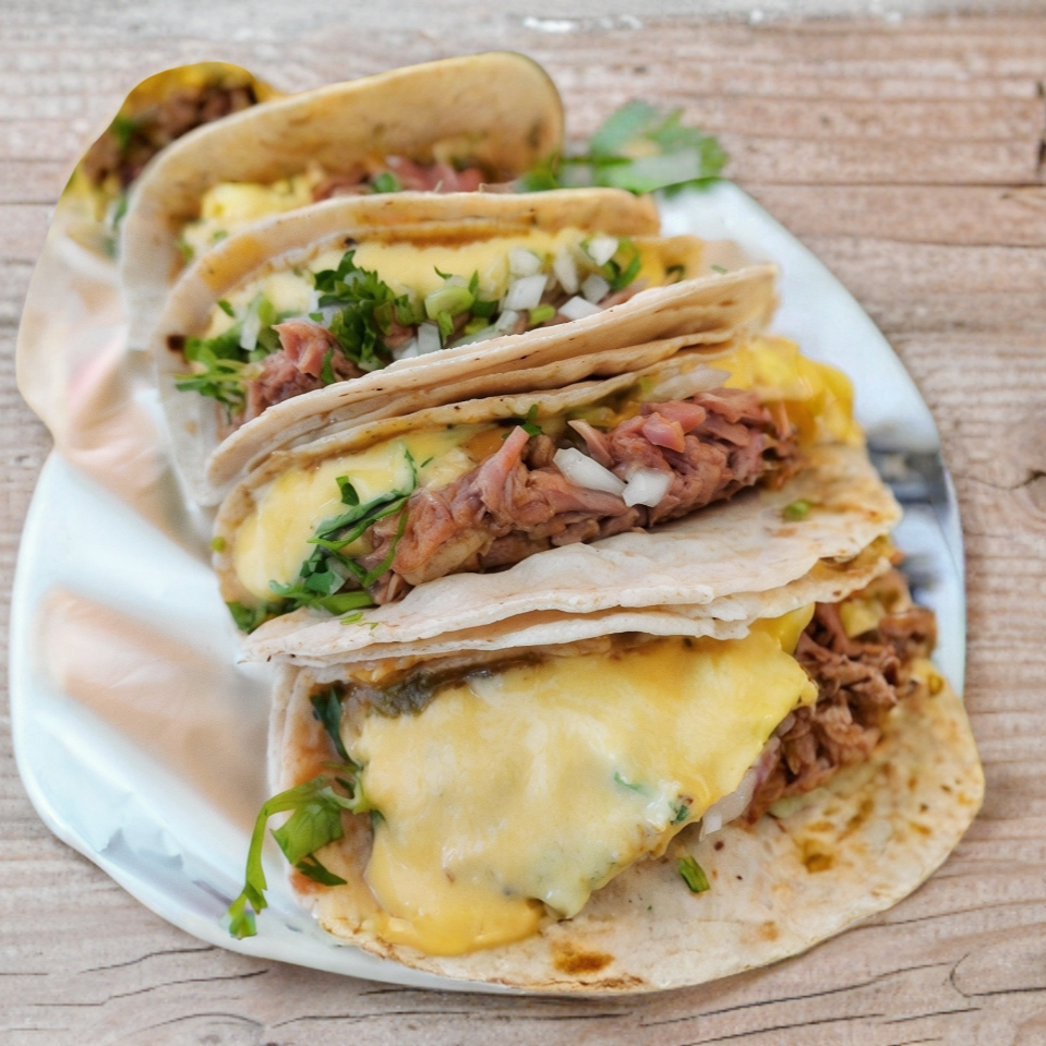 Taco doradito de barbacoa cubierto de queso oaxaca