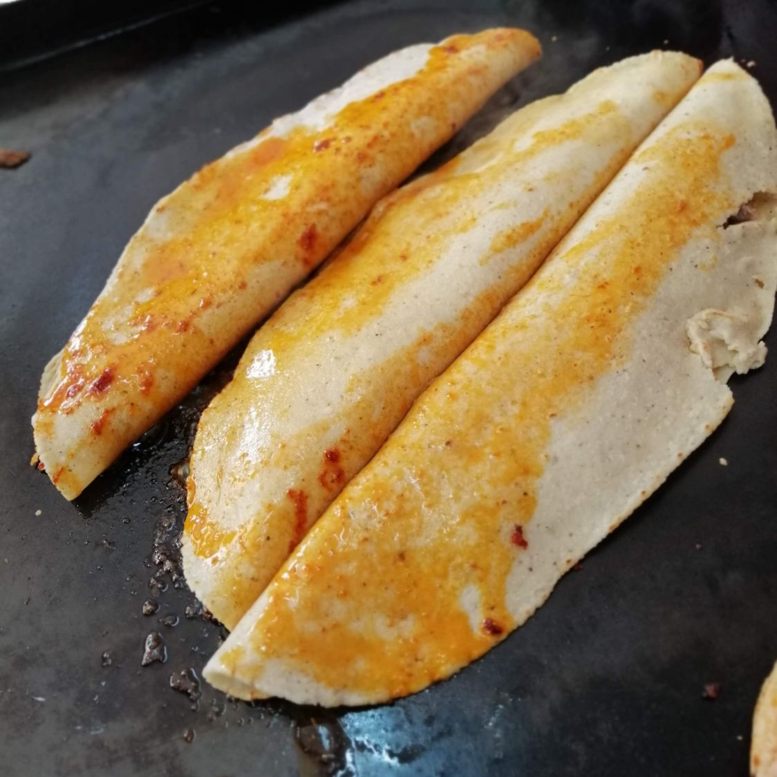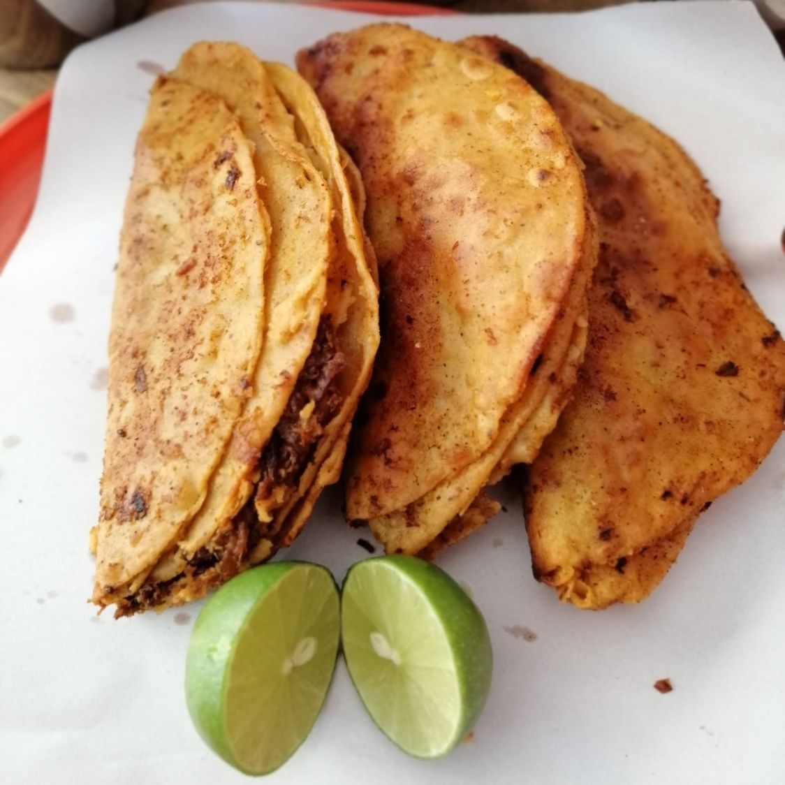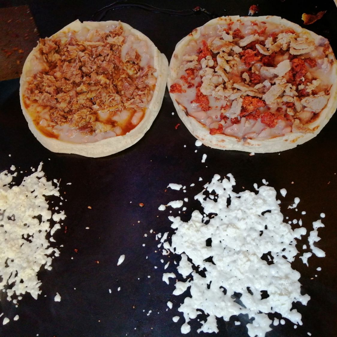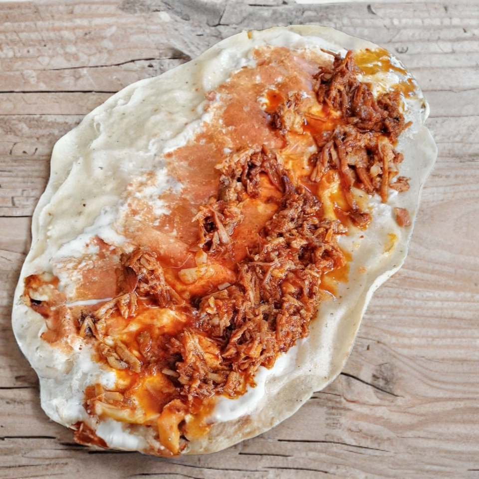 Tortilla hecha a mano de aprox. 30cm con queso fundido al comal y rellena de barbacoa.