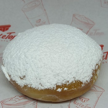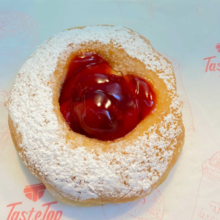 Espolvoreada de azúcar glas con centro de jalea de cereza.
