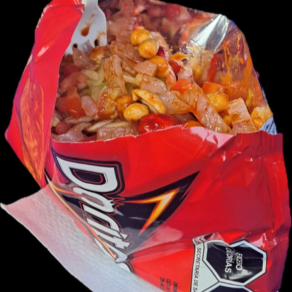 Ricos dorilocos, acompañados con su verdura fresca, cueritos, cacahuates y salsa de su elección