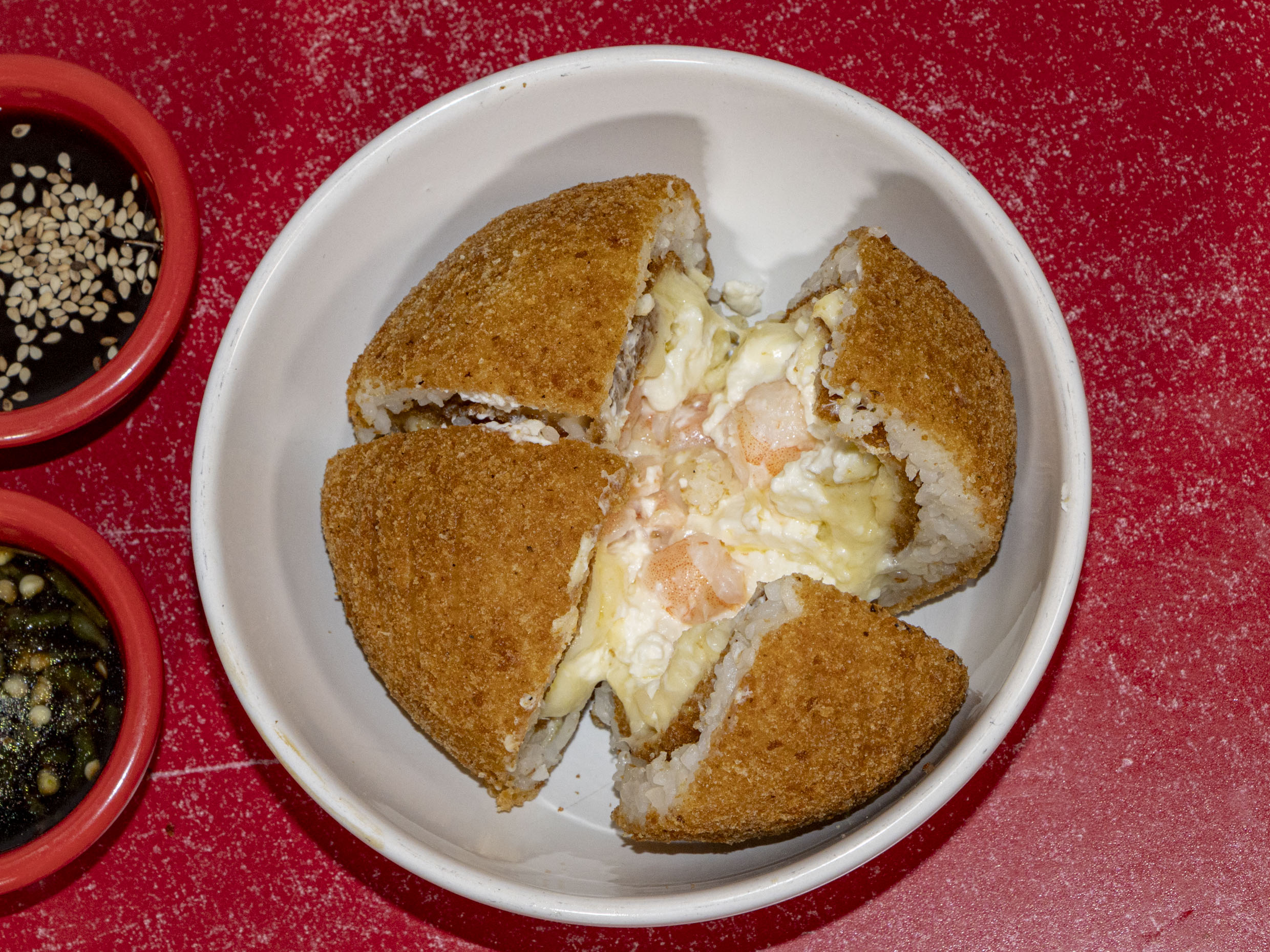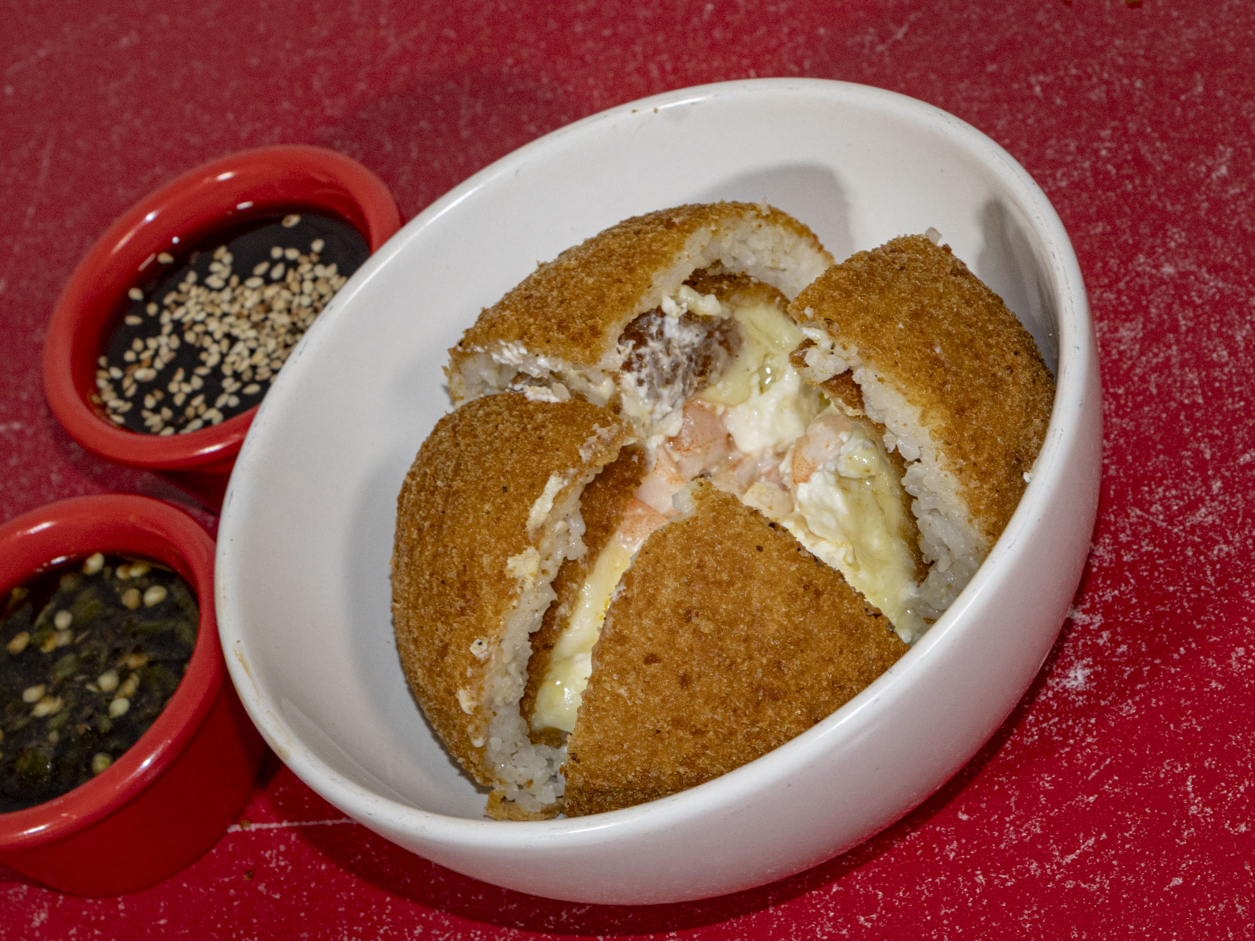 Bola de arroz empanizada con relleno de queso.