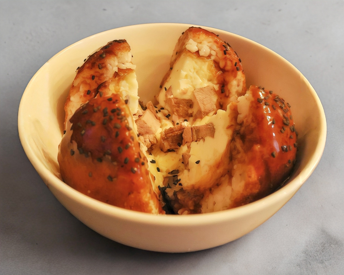 Bola de arroz empanizada con relleno de queso.