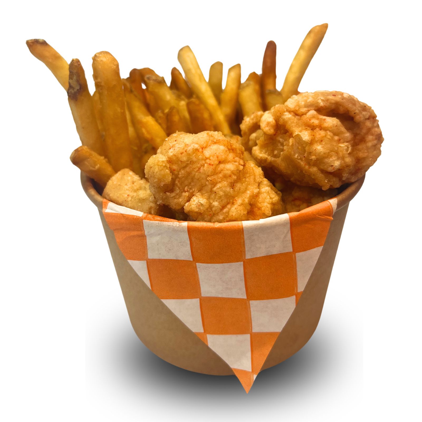 Bowl tradicional de papas house (papas a la francesa), boneless. Todos los boneless son de pollo.